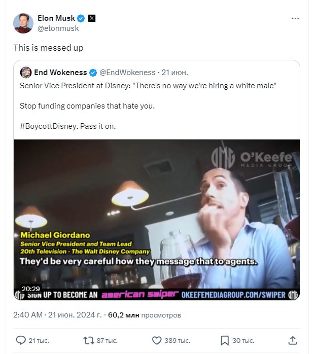 Журналист Джеймс О 'Киф (James O'Keefe) известный своими провокационными материалами, недавно опубликовал результат своей новой агентурной операции, которая рассказывает о политике найма сотрудников корпорации Disney по расовой принадлежности. Материал вызвал бурную реакцию общественности, в стороне не остался и Илон Маск (Elon Musk).