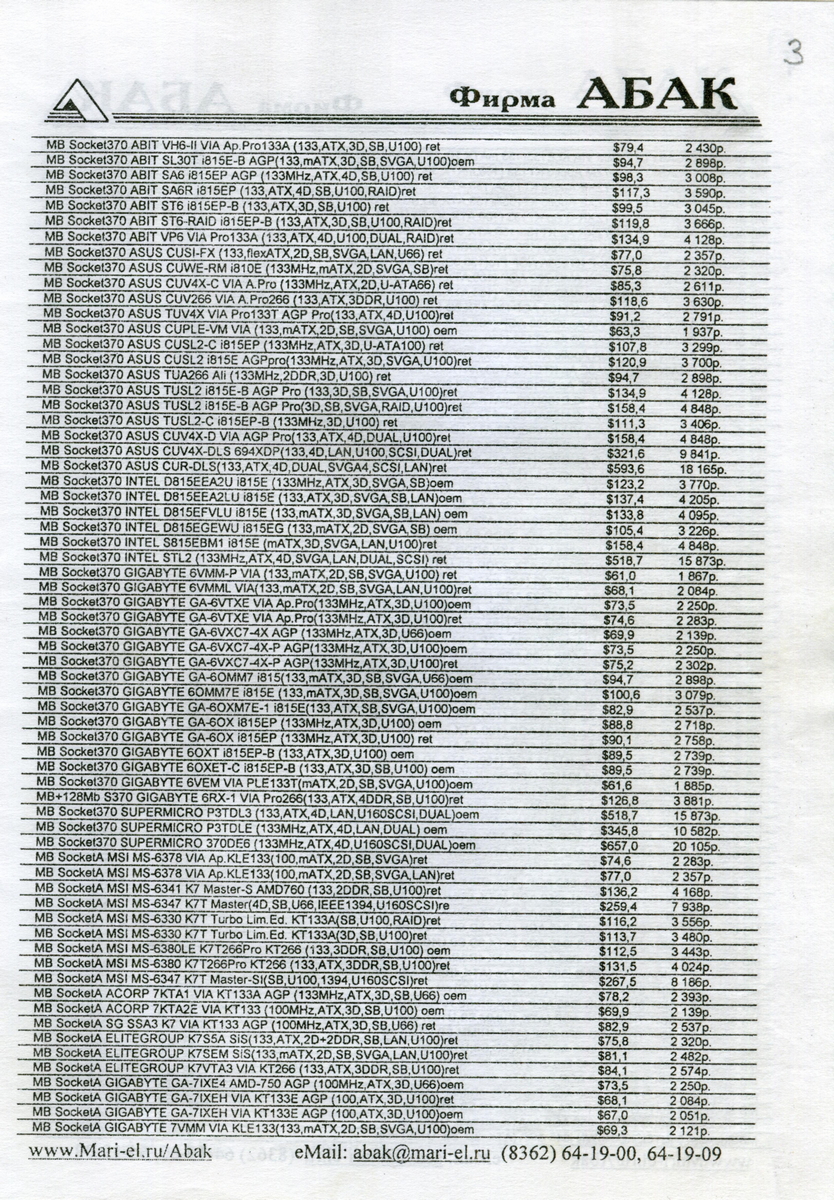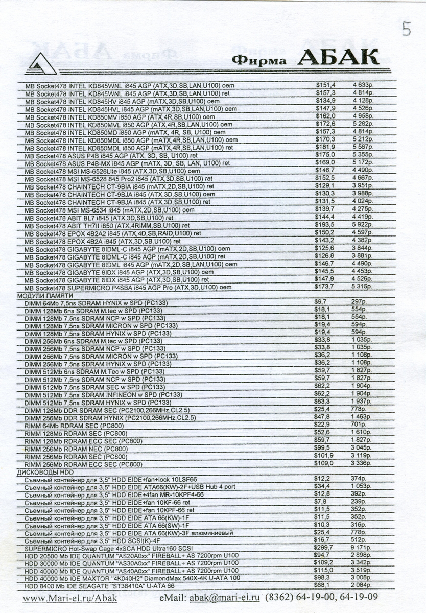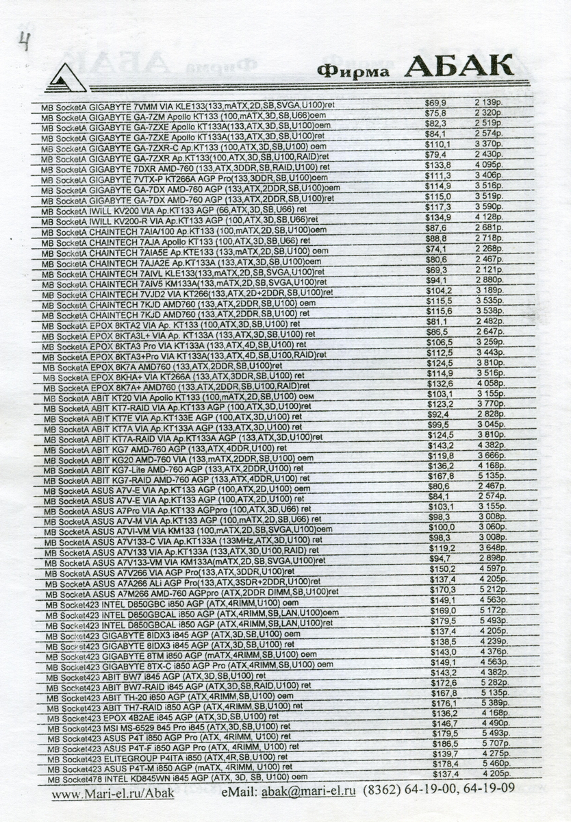 Из интересного. Пеньки 4 есть как 423-и так и 478-ые. Уже появляется джифорс 3. Цветные лазерные принтеры тоже есть в наличии, правда по негуманным ценам.