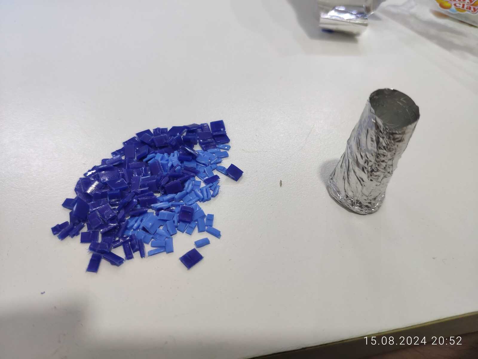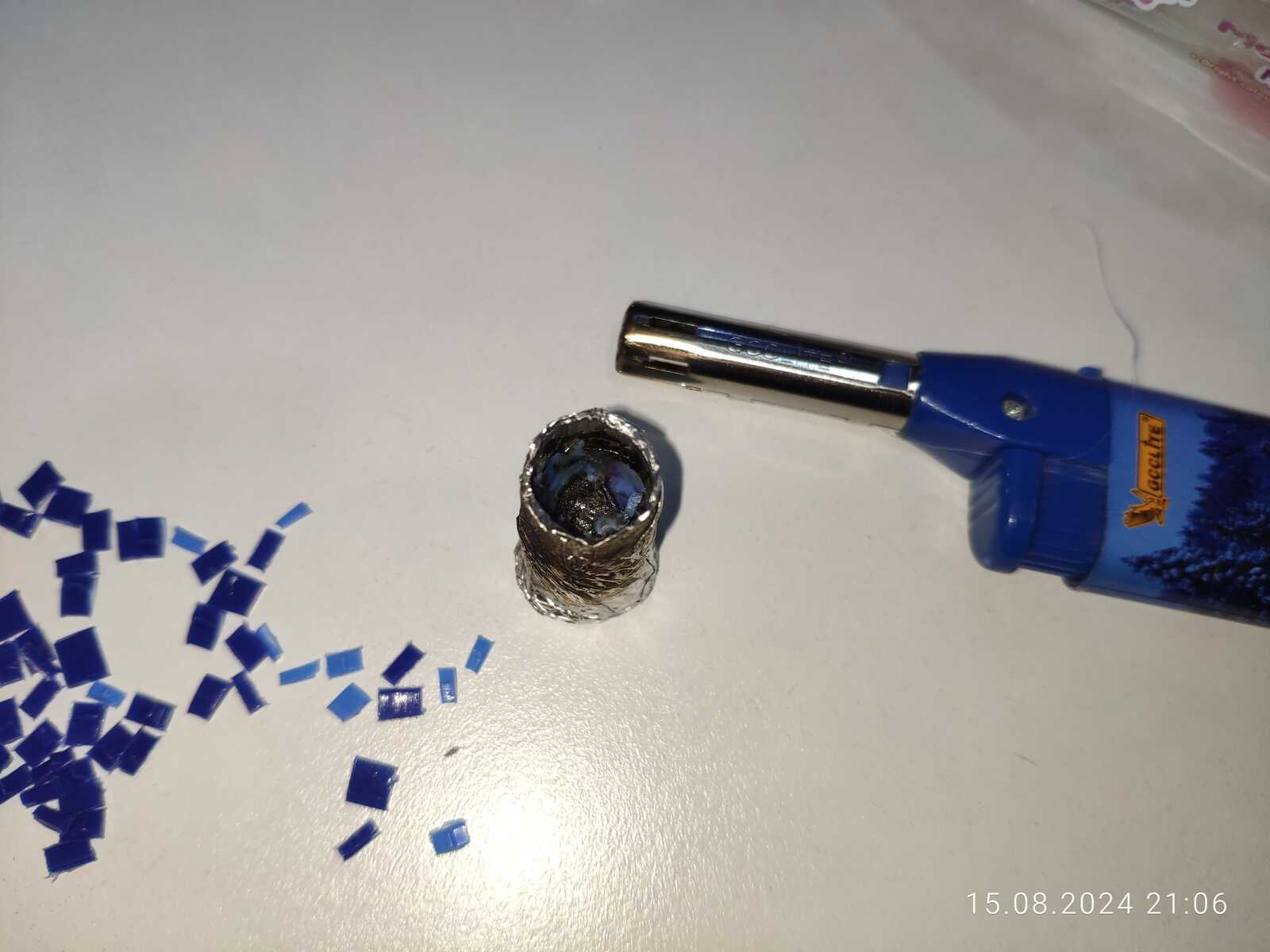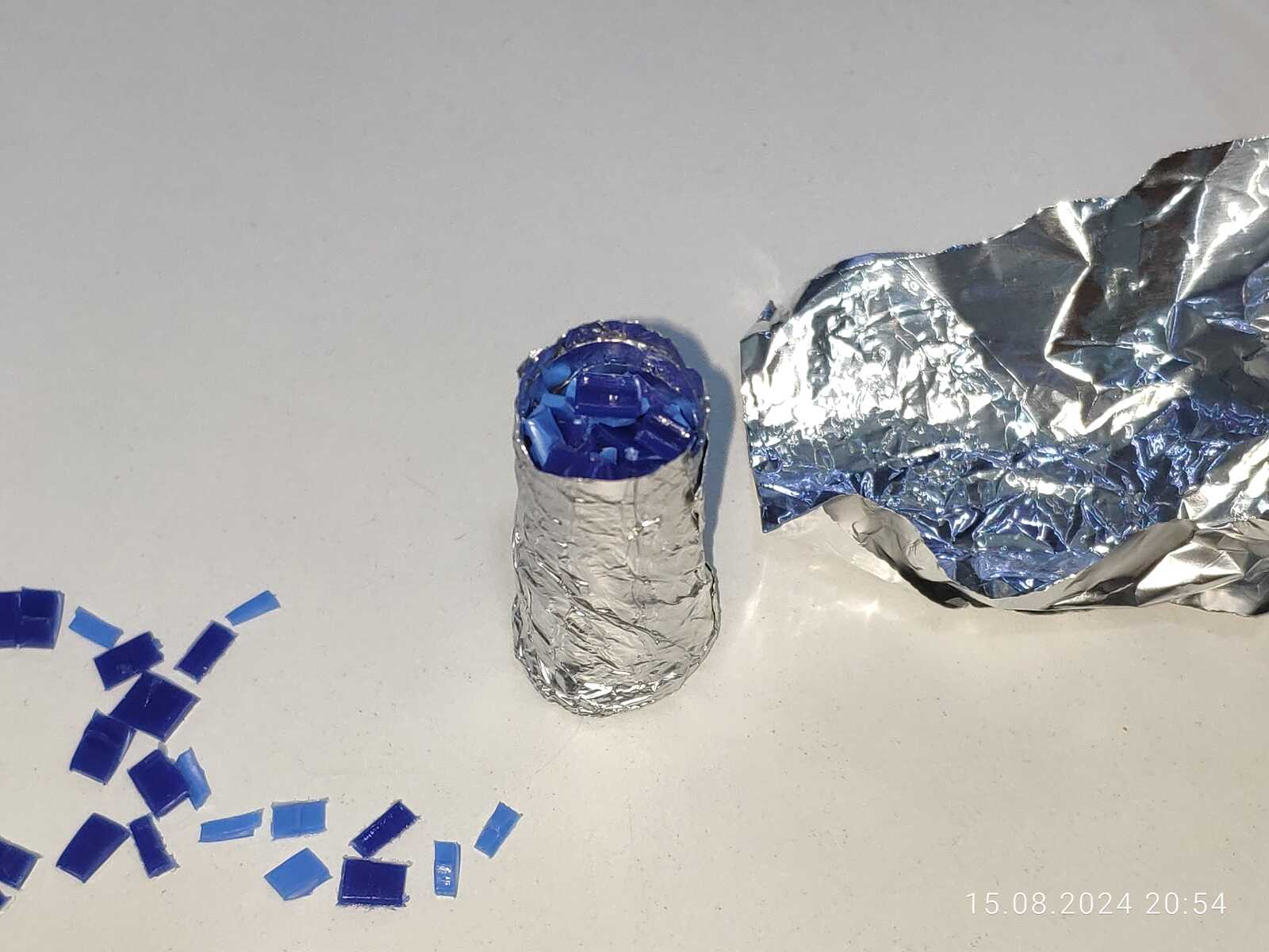 Потому взял прут термоклея, и намотал на него форму из фольги, да, первый слой приклеился немного, но остальное снялось, осталось нарезать гранулы полипропилена и расплавить: