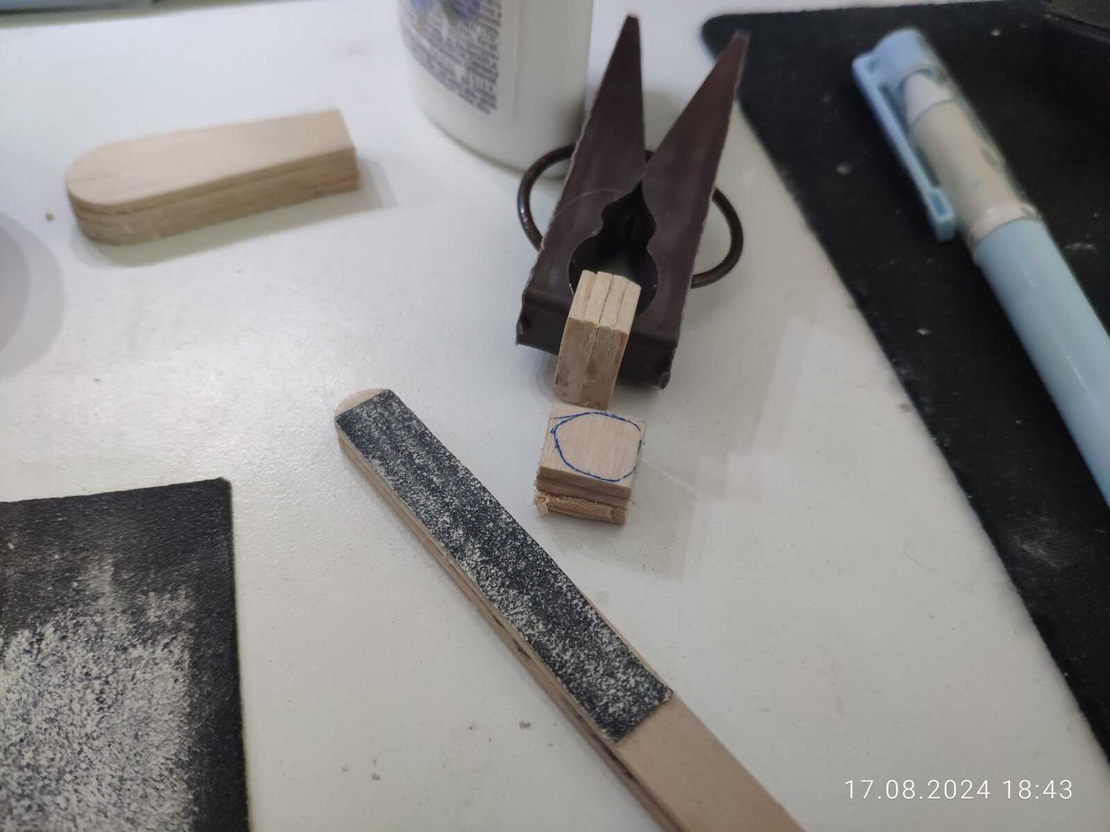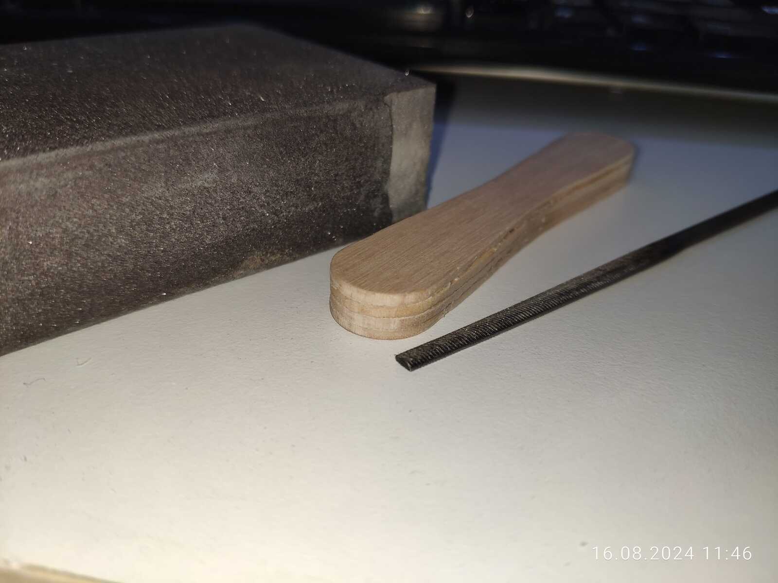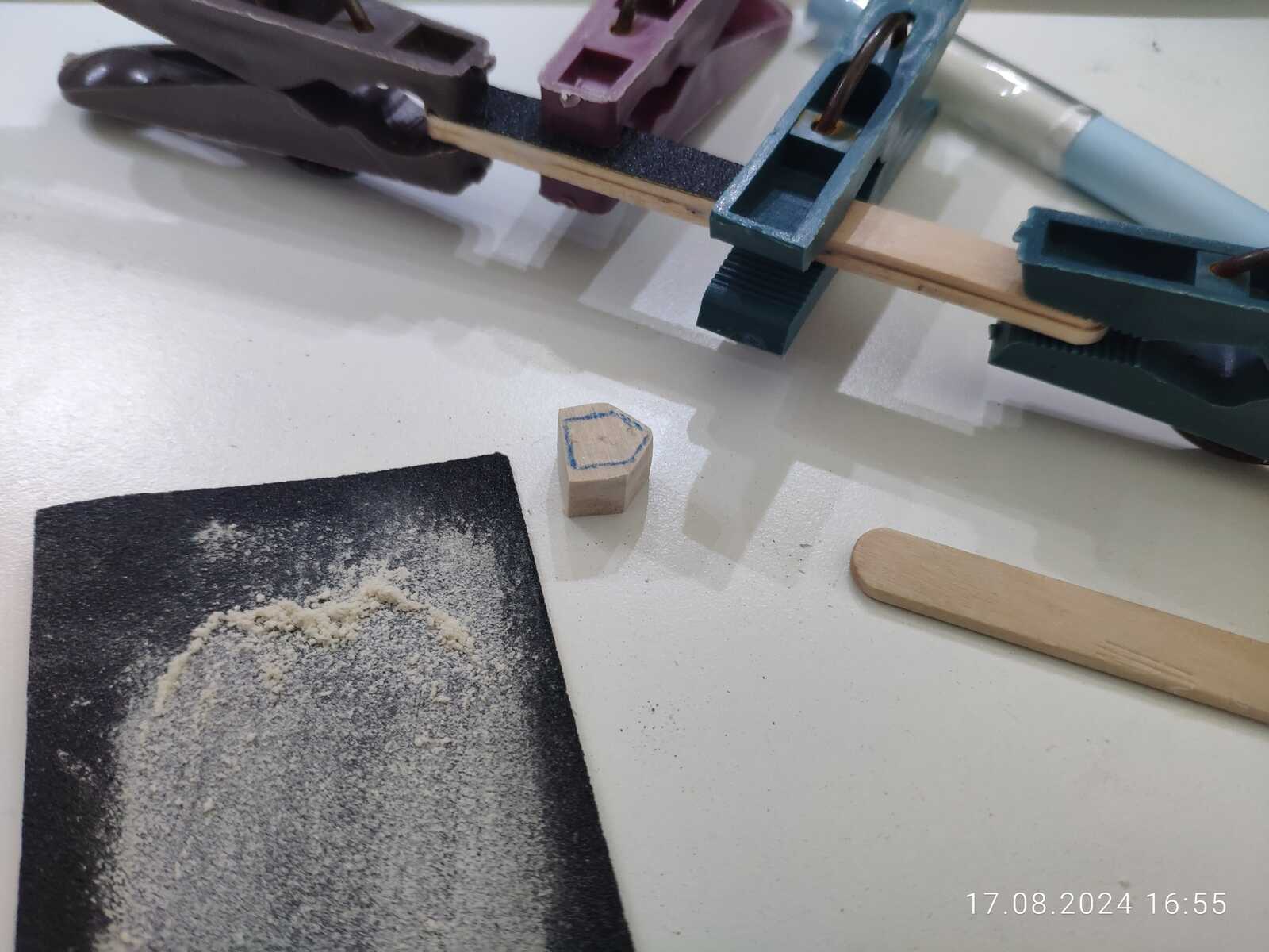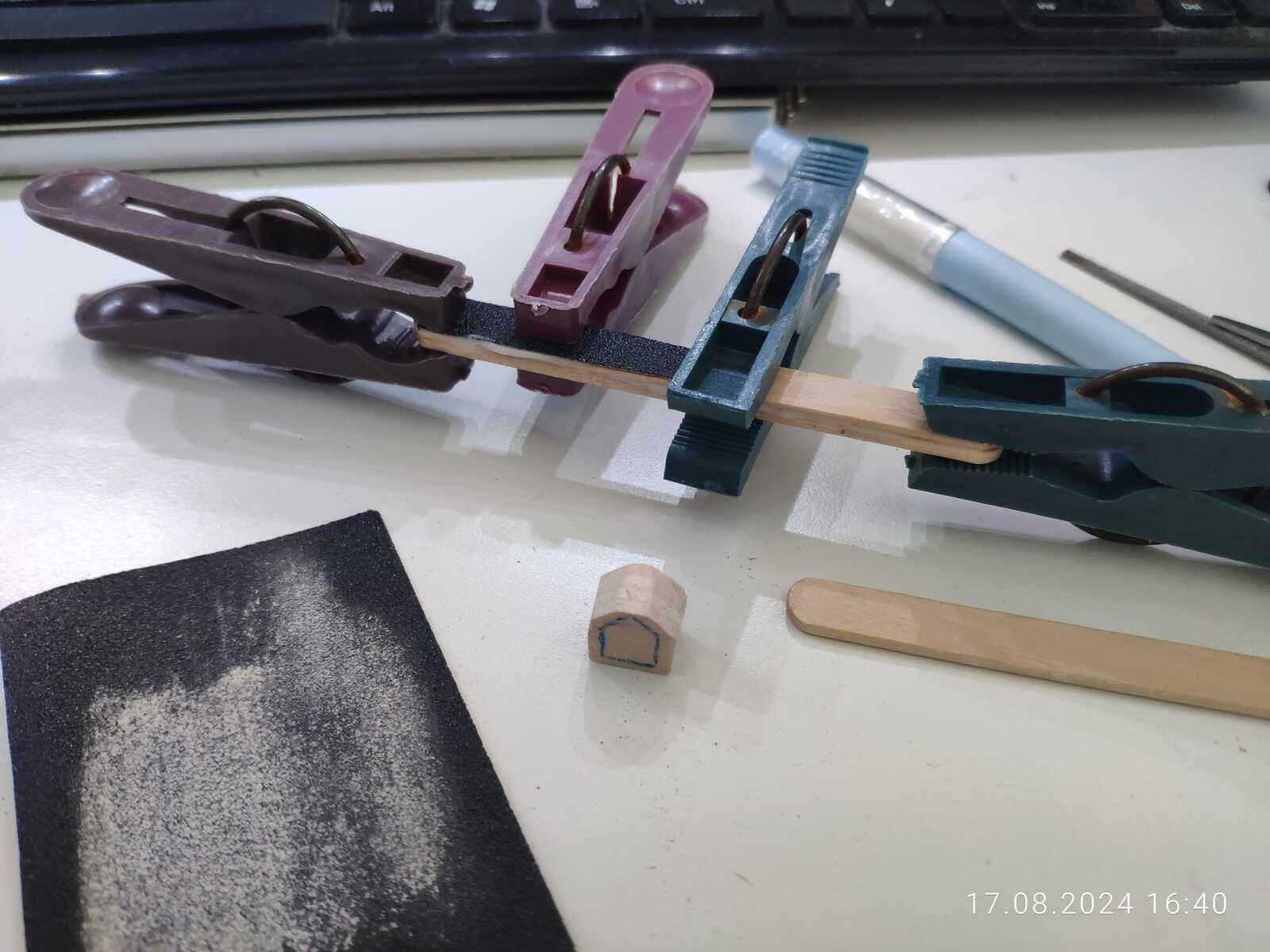 Попутно склеиваю две палочки от мороженого с наждачной бумагой, будет импровизированный напильник: