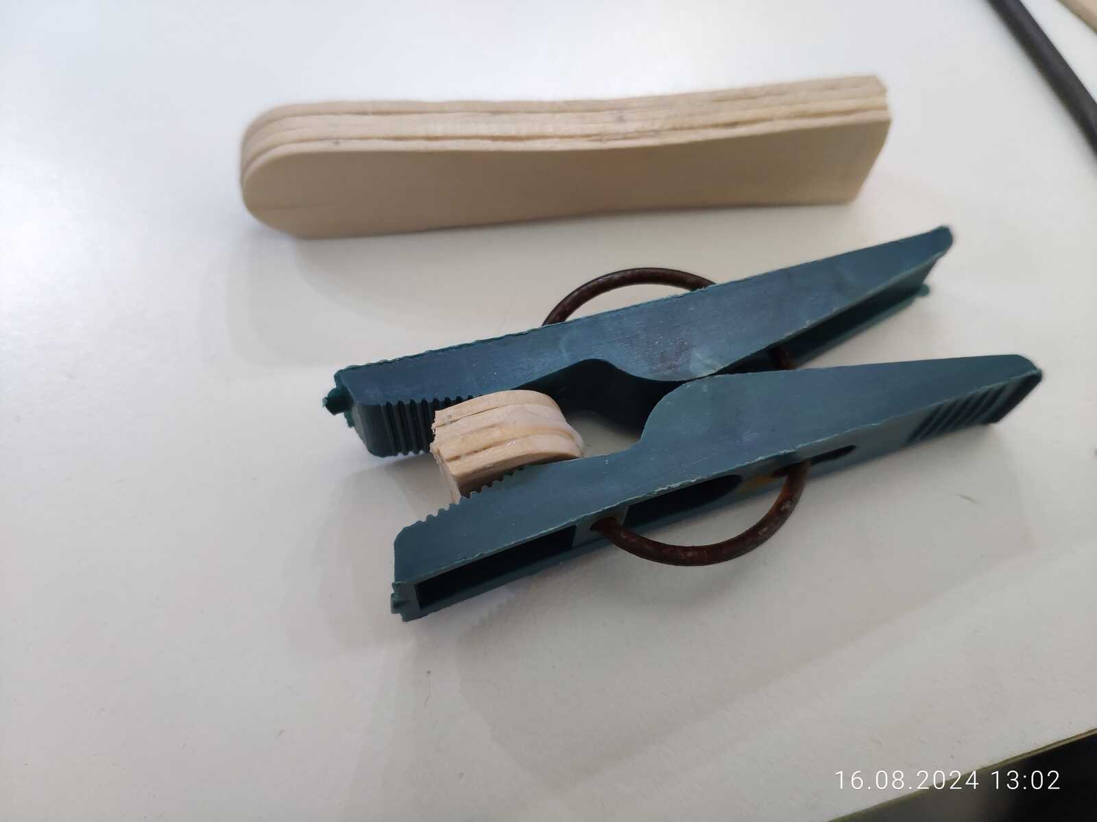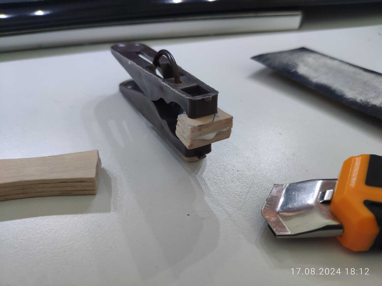 Упс, у меня не склеился средний слой, неужели слишком сильно зажал нейлоновыми стяжками? Наливаю побольше клея и на второй раз сжимаю прищепкой для белья, чтобы не передавить: