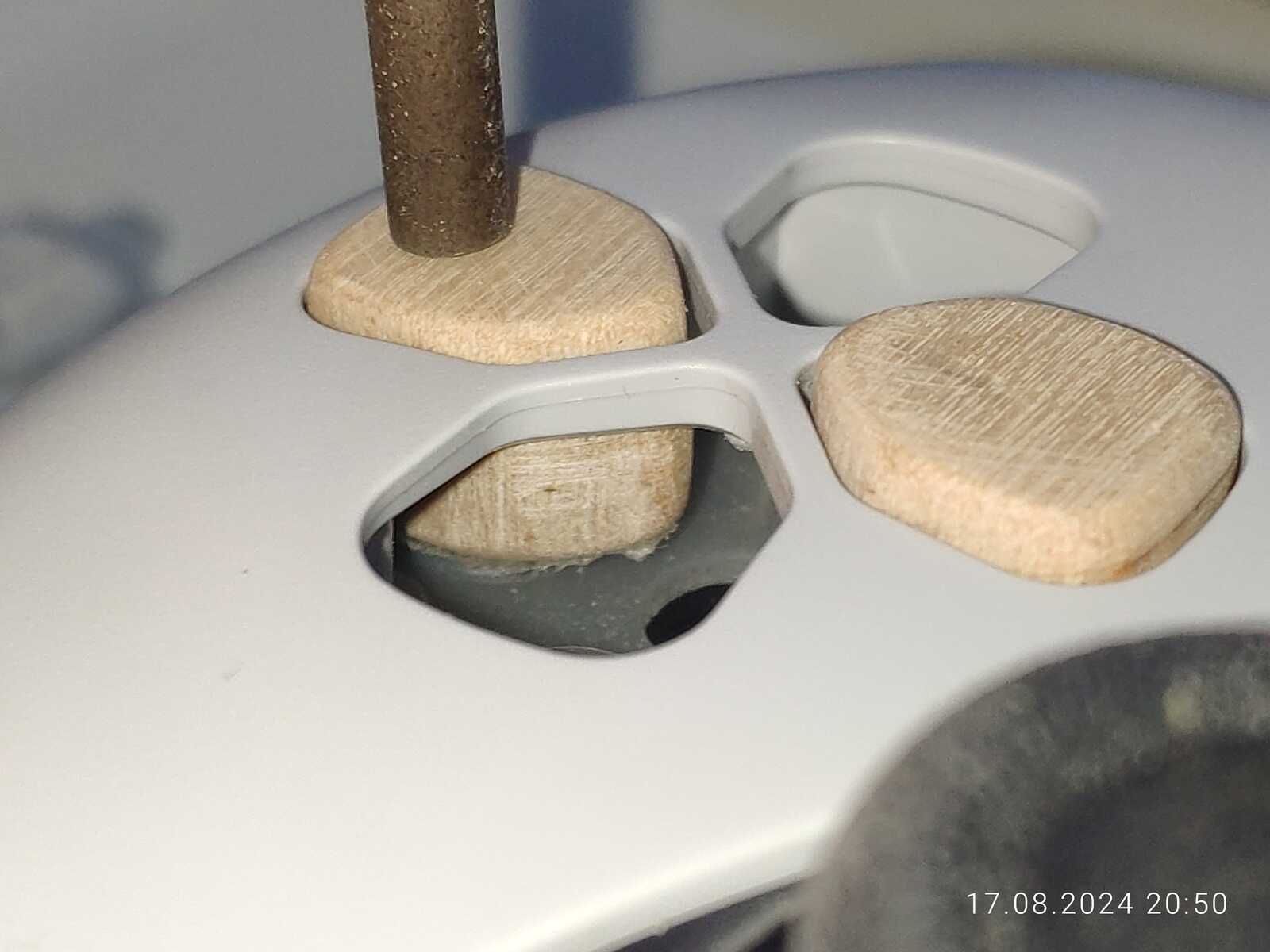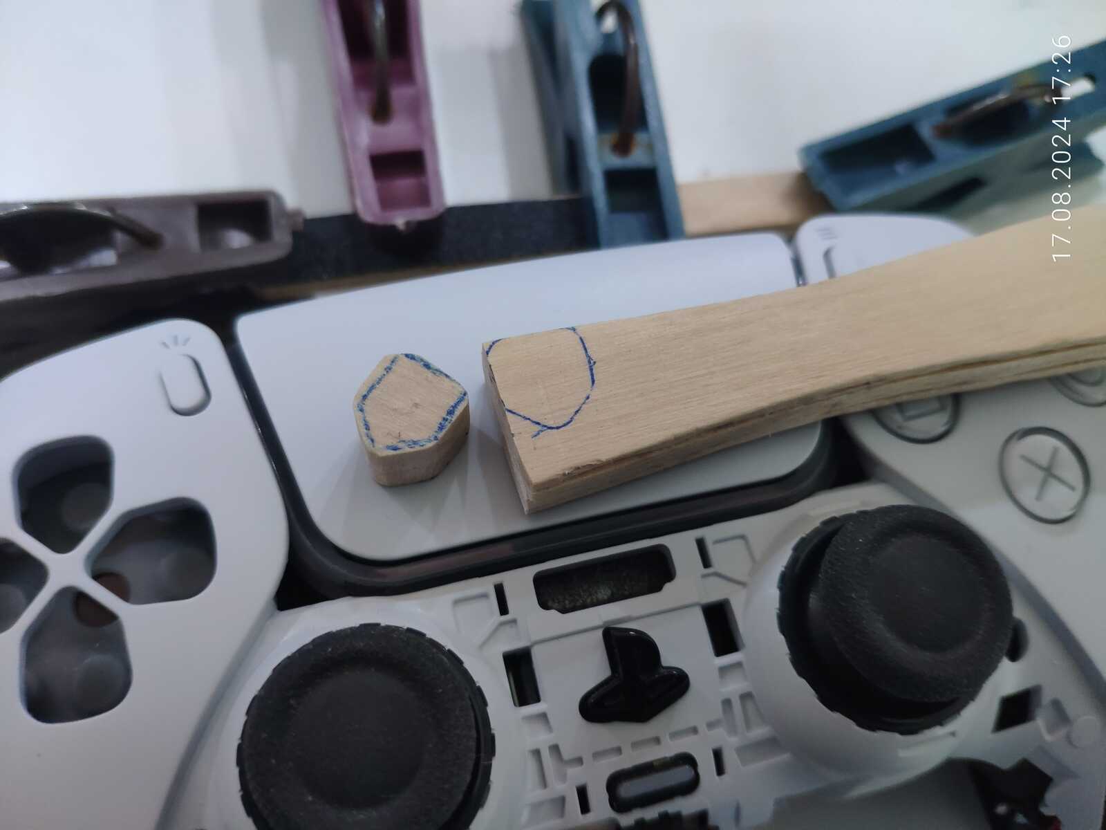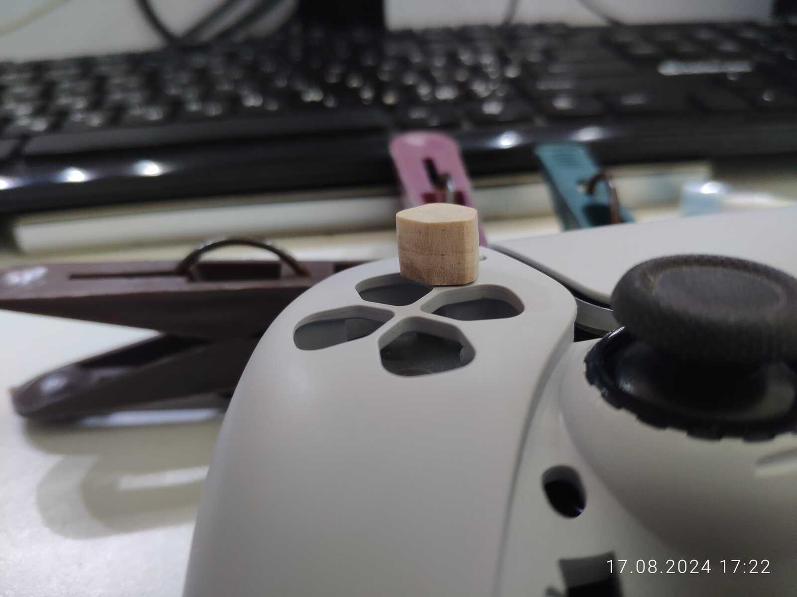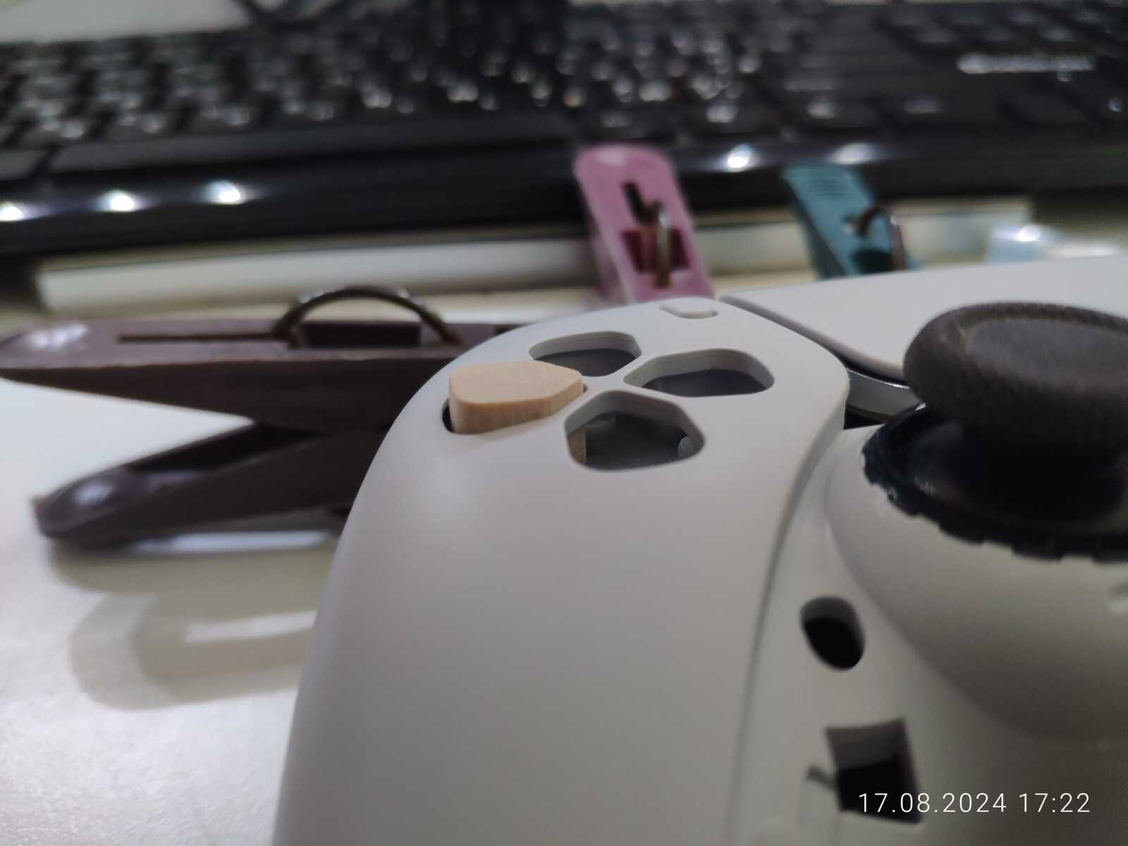 Можно конечно было приклеить ещё один слой древесины в виде юбки, чтобы предотвратить выпадение кнопок, но я так подумал, и нет, не буду заморачиваться, просто приклею на двухстороннюю клейкую ленту к резинке, лень разбирать в очередной раз несчастный геймпад от Sony PlayStation 5...