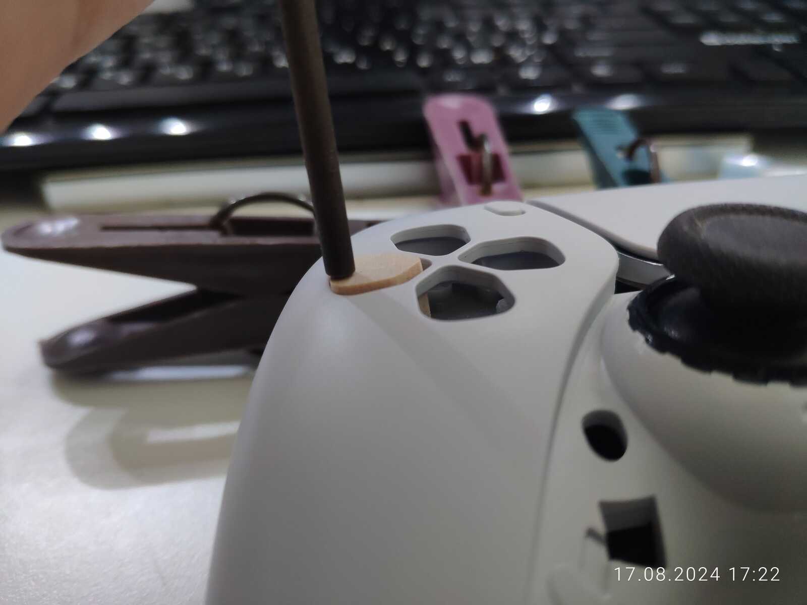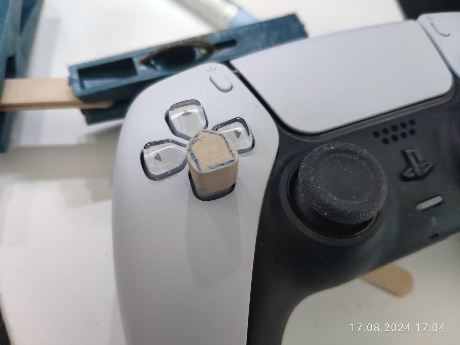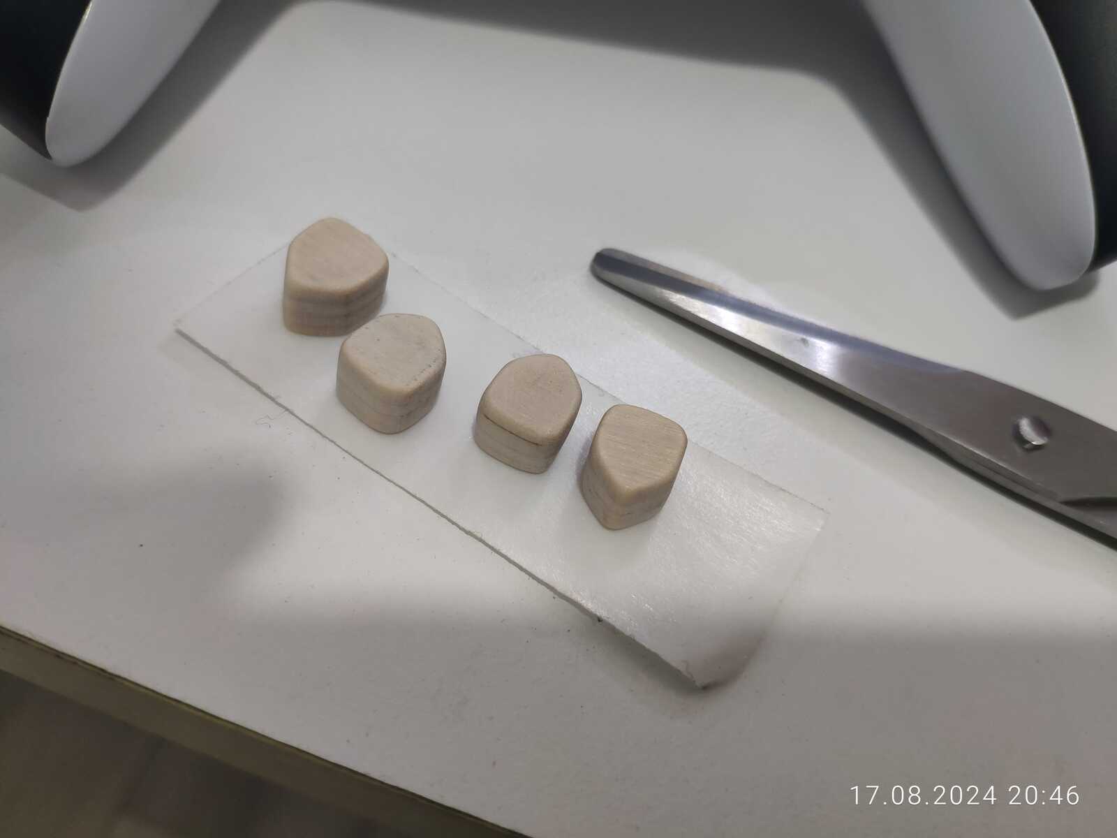 Можно конечно было приклеить ещё один слой древесины в виде юбки, чтобы предотвратить выпадение кнопок, но я так подумал, и нет, не буду заморачиваться, просто приклею на двухстороннюю клейкую ленту к резинке, лень разбирать в очередной раз несчастный геймпад от Sony PlayStation 5...