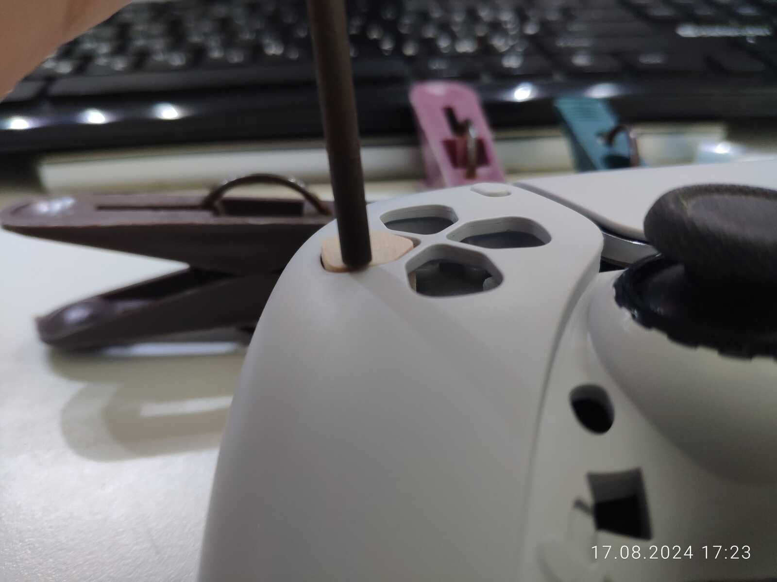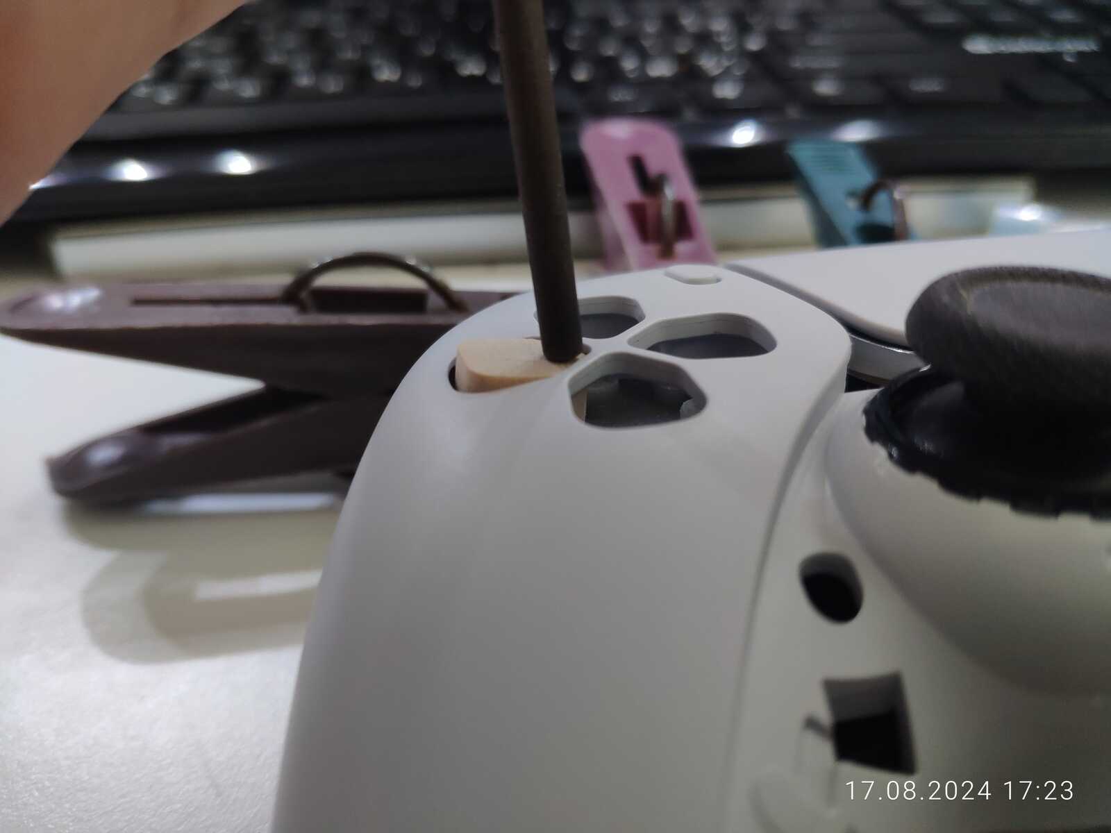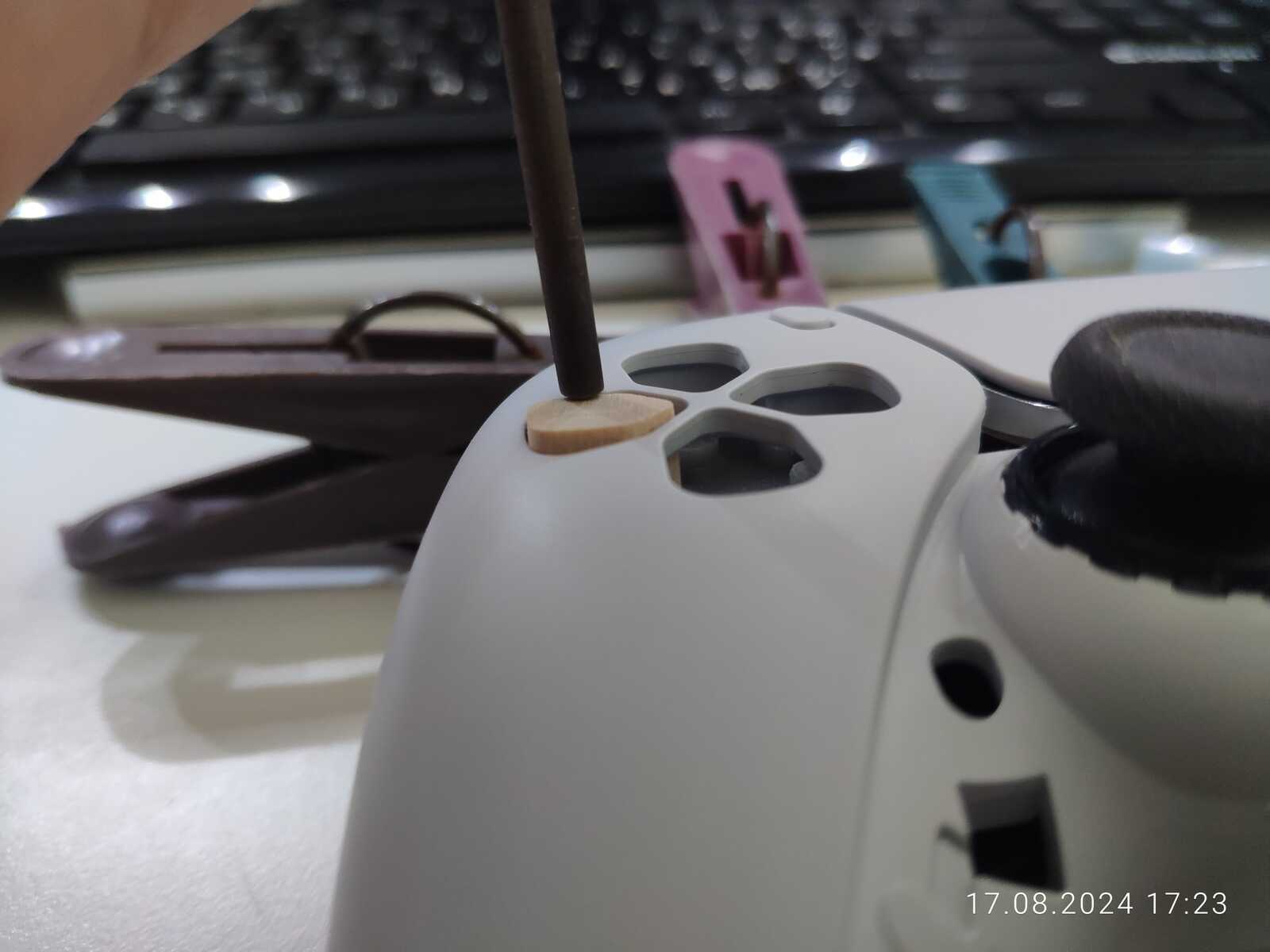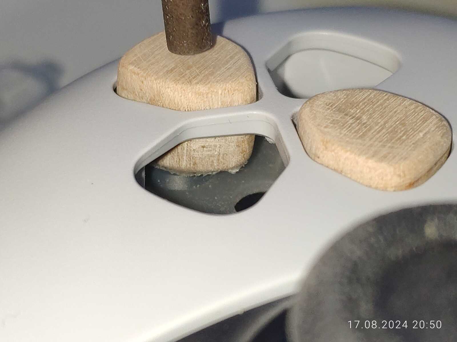 Можно конечно было приклеить ещё один слой древесины в виде юбки, чтобы предотвратить выпадение кнопок, но я так подумал, и нет, не буду заморачиваться, просто приклею на двухстороннюю клейкую ленту к резинке, лень разбирать в очередной раз несчастный геймпад от Sony PlayStation 5...