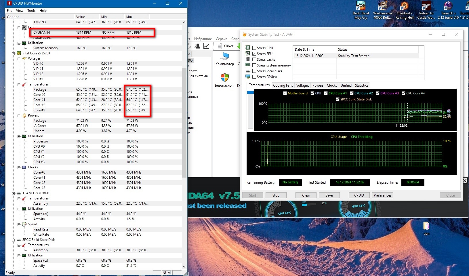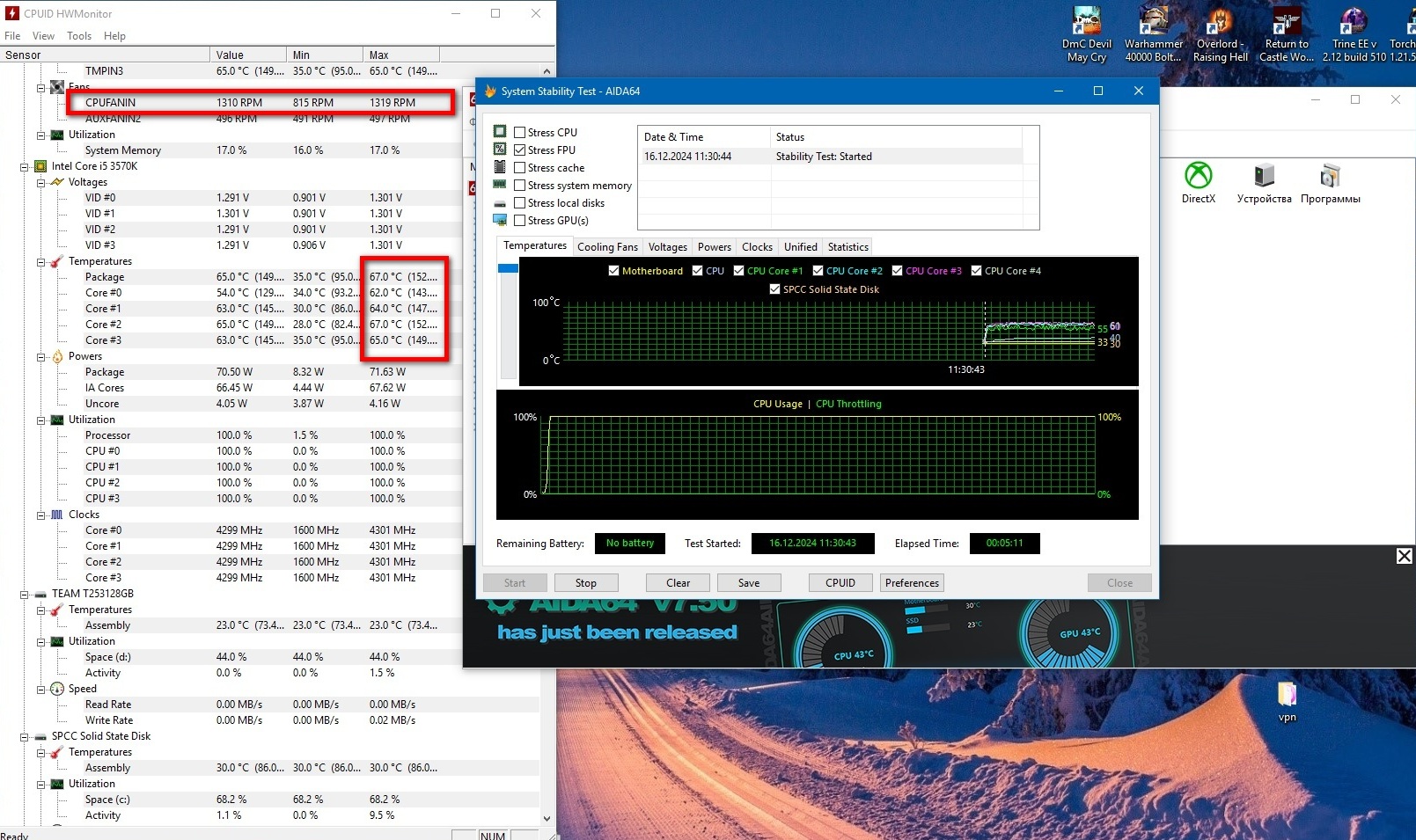 Тестирование пройдет в программе AIDA64 (FPU only) в течение 5 минут.