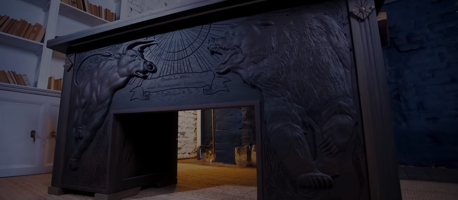 На фронтальной стороне стола высечены бык и медведь под солнечными лучами, символизирующие вечную борьбу на рынках - те самые бычьи и медвежьи настроения. Между ними выгравирована надпись "Время не вечно, наши возможности бесконечны". На самой столешнице нанесено изображение солнечной системы. На боковых панелях стола также выгравированы два разных изображения, на одном из которых можно разглядеть "криптошахтёра", тянущего руку к минералу.