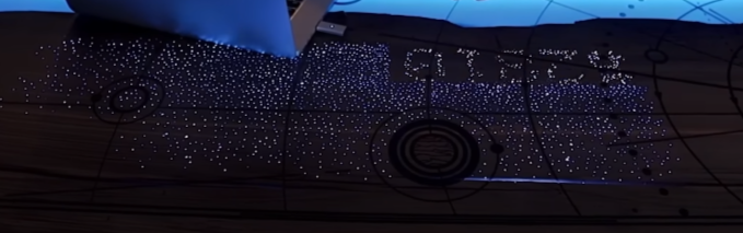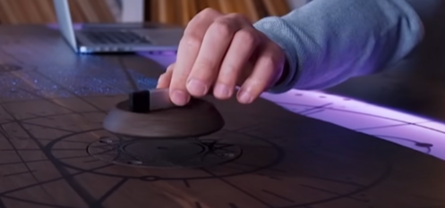 После того как владелец стола прикладывает палец к сканеру отпечатка, стол переходит в активный режим. От сканера отпечатка пальцев бегут две импульсные линии, которые сталкиваются прямо над надписью, выгравированной с фронтальной стороны. Также включается Tesla-подставка под стаканами и стаканы начинают светиться. Сама цитата начинается излучать свет. Включается RGB-полоса на столешнице. Из солнца на столе поднимается тарелка на магнитной подушке.