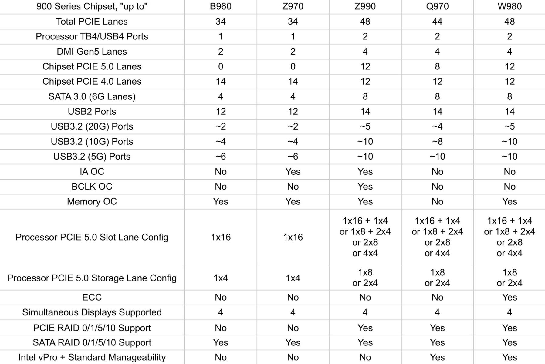 В линейку чипсетов, согласно данным, войдут пять моделей: ориентированные на массового потребителя B960 и Z970, флагманская Z990, а также модели для бизнеса Q970 и для рабочих станций W980.