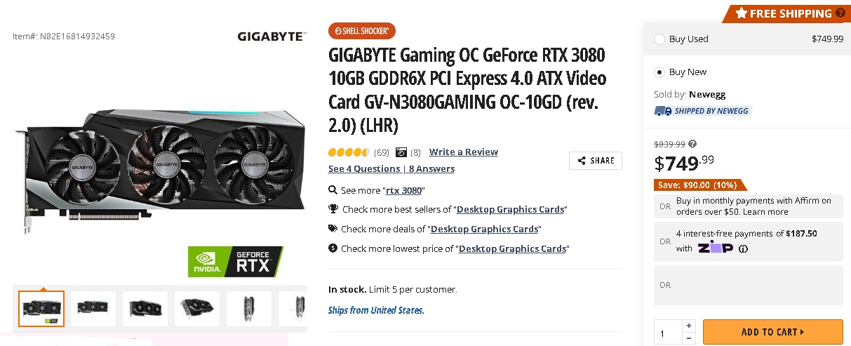 Куда же без самого интересного: видеокарта. Самое доступное флагманское решение GIGABYTE Gaming OC GeForce RTX 3080 10GB обойдётся в 750$