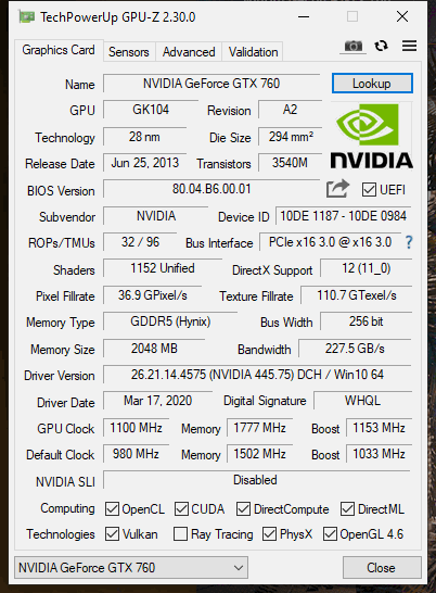 А он, на минуточку, использовался ещё в карточках 600-й линейки. А что делать — AMD в то время ничего особо интересного не выпускала, что и позволило “зелёным” без лишних напрягов растянуть одну архитектуру на два полноценных поколения. К слову о GK104 — для видеокарты среднего уровня его немного урезали и 760-й досталась версия чипа с 6 активными мультипроцессорными блоками. Детальные спецификации можно почерпнуть из данных утилиты GPU-Z: