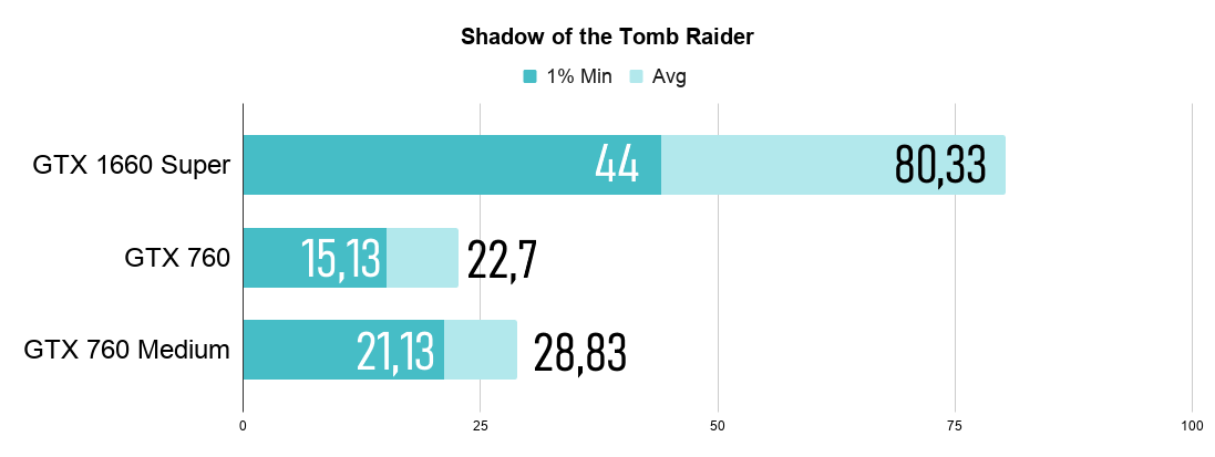 Следом у нас Shadow of the Tomb Raider. Если сравнивать с результатами в предыдущем тайтле, то сразу заметно, что средний fps в тяжёлом режиме вырос примерно в два раза. Об играбельности речи, правда, всё равно не идёт, но тем не менее. А вот на более низких настройках, наоборот — производительность оказывается хуже чем в Assassin’s Creed: Odyssey. Да и в принципе эффект от перехода с ультра настроек на средние не так уж и велик. Опять же, поиграть в SOTR на средних, имея в своём распоряжении GTX 760, можно, учитывая что это всё-таки сингл игра и тут высокий fps не так важен. Но производительность балансирует где-то на грани комфортного уровня, так что будет оправдано ещё больше снизить настройки, либо перейти на разрешение 720p. Что касается 1660 Super, то она оказывается примерно в 3,5 раза быстрее при одинаковых настройках качества.