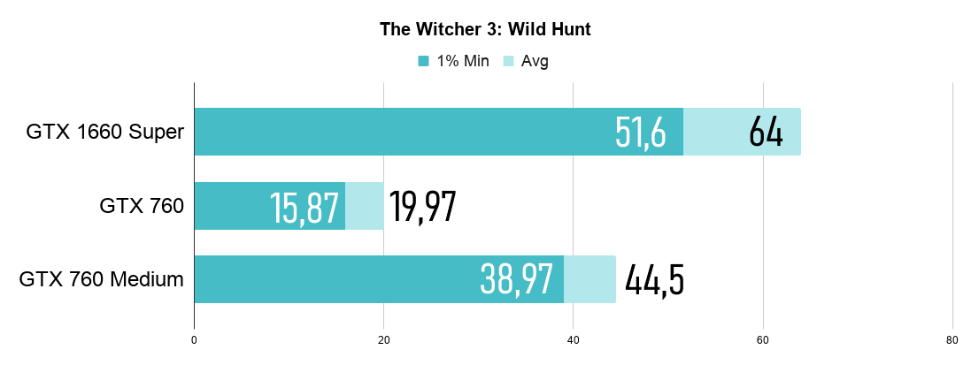 ... так можно было бы подумать, если бы не 3-й Ведьмак. Потому что это вторая игра, которой 2 ГБ видеопамяти вполне достаточно. Даже на максимальных настройках. И нет, 760-й это особо не помогло. Ведьмак 3, к слову, по возрасту не так уж далеко ушёл от GTX 760. Тем не менее, он всё равно не пощадил ветерана — 20 fps по среднему значению это максимум на что оказался способен GeForce GTX 760. Но это тот случай, когда откат на средние помог спасти ситуацию. Со средней частотой кадров выше 40 в RPG можно играть без каких-либо неудобств. Особенностью конкретно третьего ведьмака я бы назвал отличную стабильность. В том плане, что на любых настройках минимальный fps оказывается близок к среднему значению. Поэтому даже если общее быстродействие не очень высокое, восприятие картинки оказывается более позитивным, чем в случае когда средний fps выше, но происходят сильные скачки. Если продолжить сравнение с 1660 Super, то GTX 760 отстаёт в три с небольшим раза.