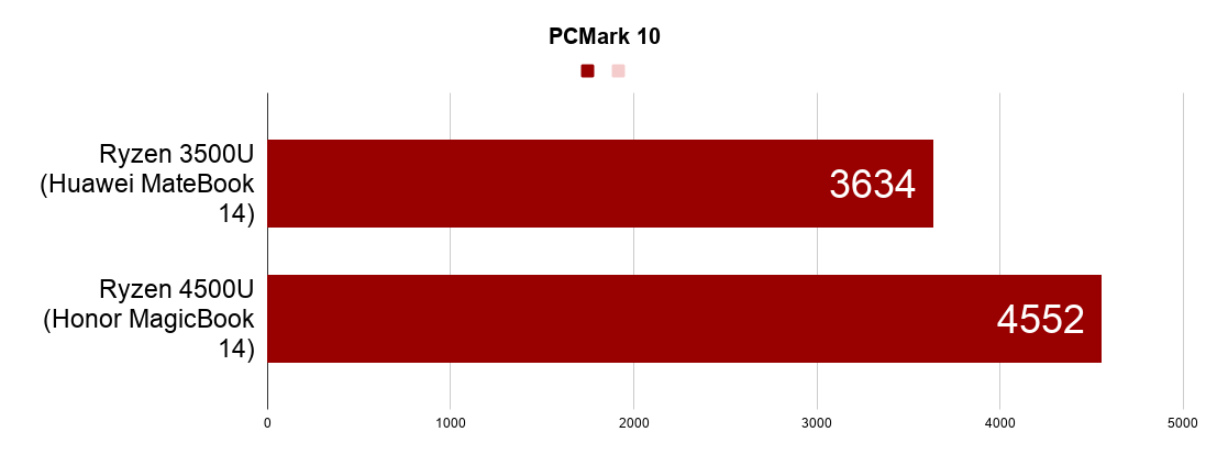 Последний синтетический бенч перед проверкой реальными играми — это PCMark, который эмулирует самые разные типы нагрузки, и выдаёт этакий общий рейтинг производительности. И согласно ему 4500U оказался быстрее на 25% по сравнению с моделью предыдущего поколения.
