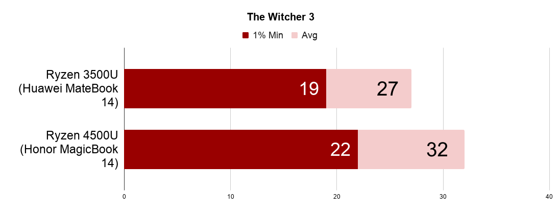 Borderlands 3 тоже нельзя назвать подходящей игрой для компактного ноута со встроенной графикой — что на старом процессоре, что на новом о комфорте говорить не приходится. Тем не менее, Ryzen 5 4500U хотя бы по среднему значению выдаёт больше 25 кадров в секунду. Не предел мечтаний, но это и не игровой ноут.