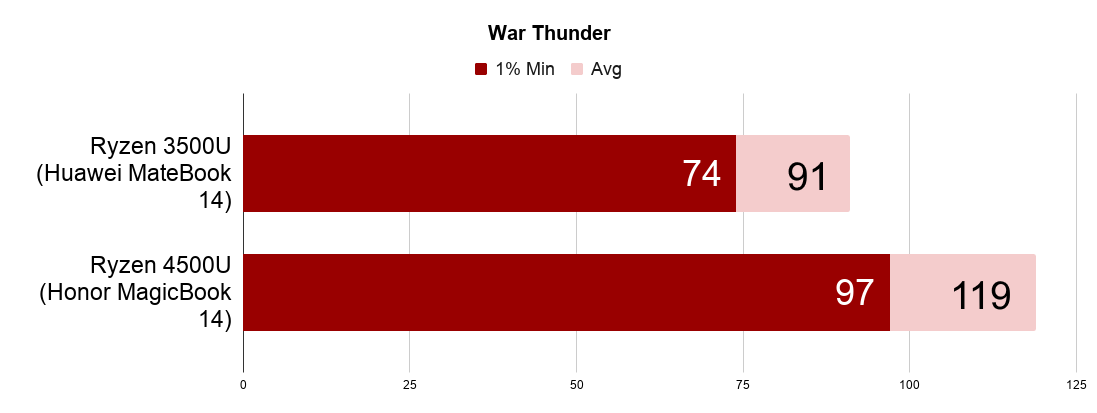За сетевые проекты у нас сегодня War Thunder. С её отличной оптимизацией, на самом деле, можно играть даже на высоких и в Full HD. Ну а на таких настройках которые выбрал я, проблем с ней не возникает ни у условно старого Ryzen, ни, тем более, у нового. Если говорить о сравнении, то +30% быстродействия по среднему количеству кадров в секунду при переходе на ноут с новым процессором.