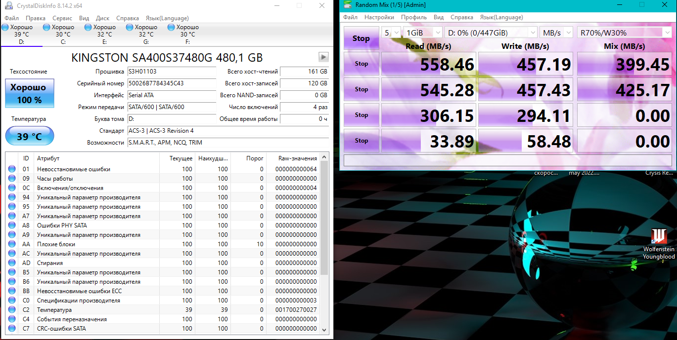 Накопитель относится к бюджетному сегменту. Производитель обещает нам до 500МБ/с на чтение и 450МБ/с на запись. TBW для данного объема - 160 Тб.