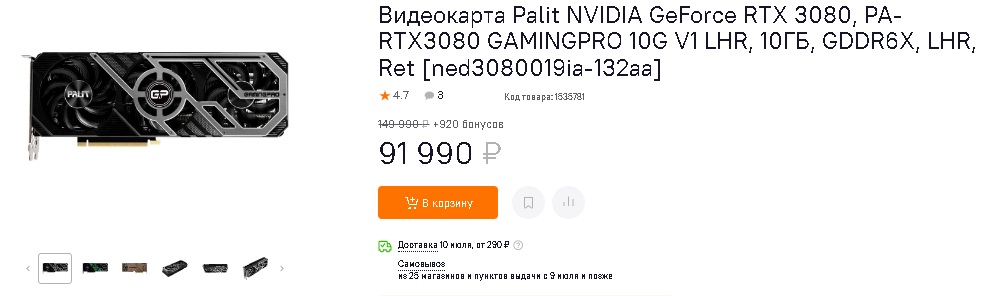 Двумя днями ранее они карты еще были в наличии по цене в 79,990 рублей (практически рекомендованная). По этой же цене можно было приобрести Palit NVIDIA GeForce RTX 3080 и модели от AMD RX 6800: