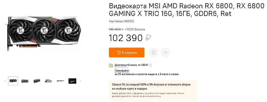 И до 102,390 рублей на RX 6800, но здесь стоит отметить: 79,990 стоил вариант от Gigabyte, предположительно, будь она еще в наличии, оценили бы её тысяч на 10 дешевле MSI.