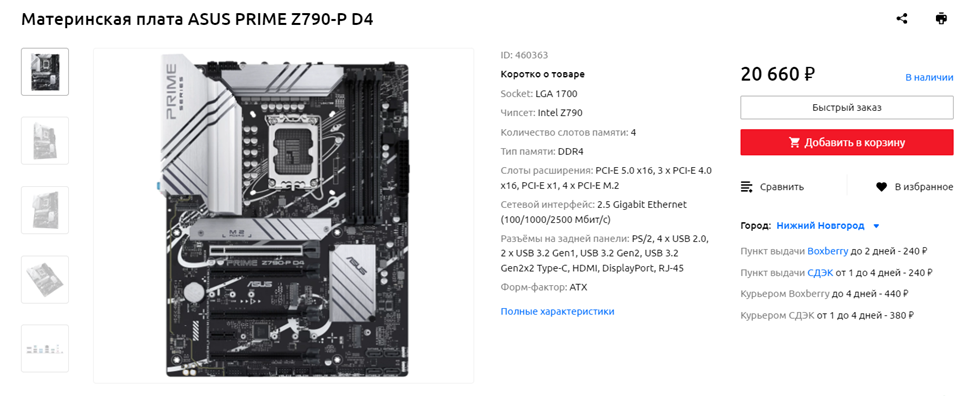 Одной из наиболее доступных МП, удовлетворяющих перечисленным требованиям и пожеланиям, является модель от тайваньской компании ASUS под названием PRIME Z790-P D4. Конечно, по меркам флагманских чипсетов, это несколько бюджетное устройство: например, не все разъемы M.2 для SSD прикрыты радиаторами. Но у нас и не Core i9-14900KF, чтобы приобретать к нему в пару топовую материнскую плату. Для Core i5-13600KF возможностей PRIME Z790-P D4 вполне достаточно.