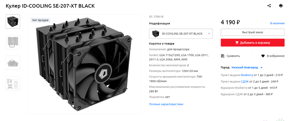 К разгоняемому процессору стоит взять систему охлаждения субфлагманского или флагманского уровня – с двухсекционным радиатором и двумя вентиляторами. Один из самых доступных на рынке вариантов – ID-COOLING SE-207-XT. Только учтите, что одну из «вертушек», вероятно, придется немного сместить выше, чтобы поместились модули оперативной памяти. Это, впрочем, не критично – эффективности охлаждения выбранному кулеру для Core i5-13600KF хватит с запасом. Разница в энергопотреблении и тепловыделении между этим процессором и старшими моделями Intel Raptor Lake/Raptor Lake Refresh с 8 производительными ядрами довольно велика. Так, Core i7-13700KF уже невозможно охладить при помощи воздушной СО в стресс-тестах или при работе в многопоточном программном обеспечении, хотя в играх суперкулеры уровня Noctua NH-D15 с этой задачей справляются. Отвести тепло от Core i5-13600KF значительно проще, поэтому тратиться на систему жидкостного охлаждения нет необходимости.