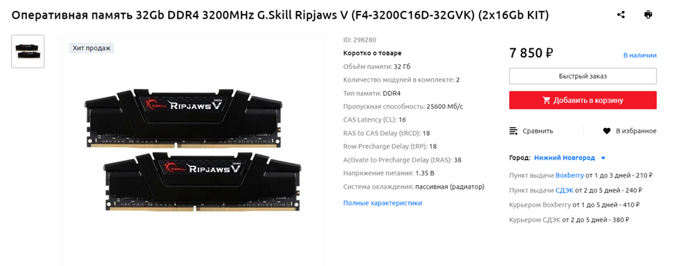 Если бы бюджет был побольше, я бы предложил установить в сборку пару шестнадцатигигабайтных модулей DDR5-7200. Или не предложил бы, потому что разумнее было бы вложиться в видеокарту или процессор. Впрочем, я отвлекся. Так вот – в 2024-2025 годах для комфортного гейминга будет хватать 32 гигабайт оперативной памяти, причем с большим запасом. При этом 16 гигабайт – уже мало, особенно если параллельно с игрой работают браузеры, мессенджеры, текстовые редакторы и другое программное обеспечение. Исходя из таких вводных, а также из того, что двухканальный режим обеспечивает значительную прибавку пропускной способности, рекомендую сразу приобрести комплект из двух планок DIMM DDR4 по 16 гигабайт каждая. Рекомендуемые частота и тайминги – 3200 МГц и выше и 16-18-18 и ниже. И еще один бесплатный совет – избегайте продукции китайских Noname-производителей.