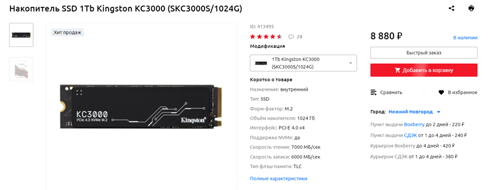 Твердотельный накопитель стоит сходу брать как минимум на терабайт. Полтерабайта и меньше для игровой конфигурации в 2024 году – это просто ничто, поскольку многие проекты занимают более 100-150 гигабайт места на диске и требуют еще столько же для установки. Не стоит забывать и о том, что операционная система также нуждается в регулярном обновлении, занимает обычно несколько десятков гигабайт и различного рода софт. Также системный SSD должен быть достаточно быстрым – выбирать следует среди PCI-Express 4.0 моделей с DRAM-буфером. Конечно, на рынке стали появляться и безбуферные накопители, по скоростным характеристикам схожие с оснащенными дополнительной оперативной памятью, но это все же пока скорее исключение, чем правило. Так что советую взять хотя бы Kingston KC3000 или ADATA Legend 960. Лучше бы, конечно, Samsung 980 Pro, но российские ритейлеры просят за решение южнокорейской корпорации слишком много.