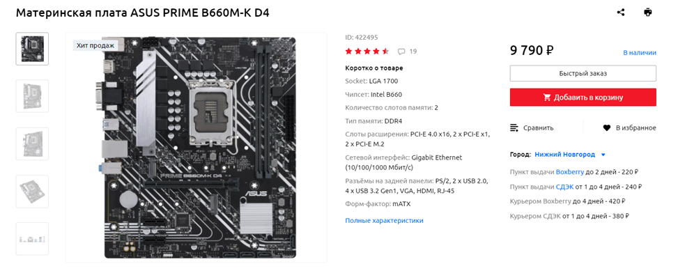 Требования к материнской плате у меня также особо не меняются – она должна быть совместима с выбранным процессором, а также обладать поддержкой четвертой версии интерфейса PCI-Express. Ну и разъемов для M.2 PCI-E твердотельных накопителей должно быть хотя бы два – одного SSD, даже терабайтного или двухтерабайтного, заядлому геймеру надолго не хватит, если он не удаляет пройденные игры. Дополнительный радиатор в области подсистемы питания с таким процессором, как Intel Core i5-12400F необходимостью не является — TDP у выбранного CPU по современным меркам весьма скромный. Впрочем, если такой радиатор есть – это в любом случае хорошо, а не плохо. В качестве примера подходящей нам материнской платы можно привести ASUS PRIME B660M-K D4. Подойдут и многие другие модели на чипсетах B660 или B760, допускающие тонкую настройку оперативной памяти.