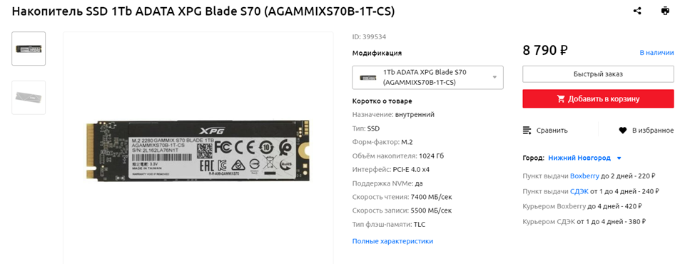 SSD: ADATA XPG Blade S70 (AGAMMIXS70B-1T-CS) 1 ТБ