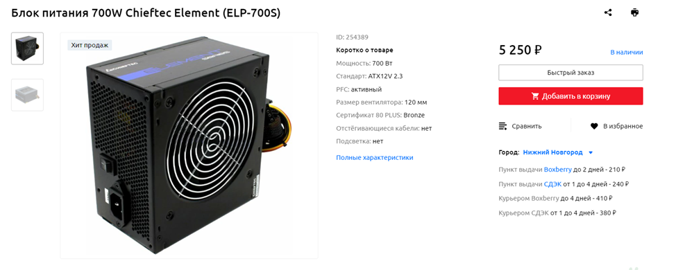 Блок питания предлагаю взять с запасом, чтобы при замене графического ускорителя на более производительный и требовательный к питанию можно было оставить старую модель. Мощности Chieftec Element ELP-700S хватило бы и для такой видеокарты, как NVIDIA GeForce RTX 4070 Ti, тем более, со столь нетребовательным CPU, как Intel Core i5-12400F. Тайваньский бренд традиционно предлагает в бюджетном сегменте качественные блоки питания с честной мощностью, достойной стабильностью напряжений и невысоким уровнем шума. В отличие от конкурентов у нее почти нет неудачных моделей, хотя, конечно, в ассортименте Zalman, DeepCool, Cooler Master и еще ряда брендов тоже имеются заслуживающие внимания недорогие БП. При этом экономить и покупать блок питания на 500-500 Вт не советую – выгадать на этом удастся максимум полторы тысячи рублей, если не брать китайское Noname-фуфло или китайское Noname-фуфло с чьим-то шильдиком, а это явно того не стоит.