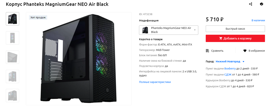 Корпуса за последние пару лет заметно подорожали, и, если какой-нибудь Zalman i3/i3 Edge совсем недавно стоил 3.5 тысячи рублей, сейчас он предлагается за 5 с лишним тысяч. В таких условиях стоит изучать рынок внимательнее и искать более привлекательные модели. Одной из них можно считать Phanteks MagniumGear NEO Air – это тот случай, когда название бренда говорит само за себя. Конечно, по меркам Phanteks, NEO Air – кейс более, чем бюджетный, но он все равно на голову выше большинства шасси, предлагаемых конкурентами в том же ценовом сегменте. Собирать и обслуживать ПК в таком корпусе удобно – места хватает и для гораздо более габаритных комплектующих, чем наши. Можно установить видеокарту длиной до 400 мм и процессорный кулер со 170-миллиметровым радиатором. Пылевые фильтры и система прокладки кабелей также имеются. Менее, чем за 6 тысяч рублей в 2024 году – отличный вариант, особенно с учетом пары предустановленных 120-миллиметровых вентиляторов.