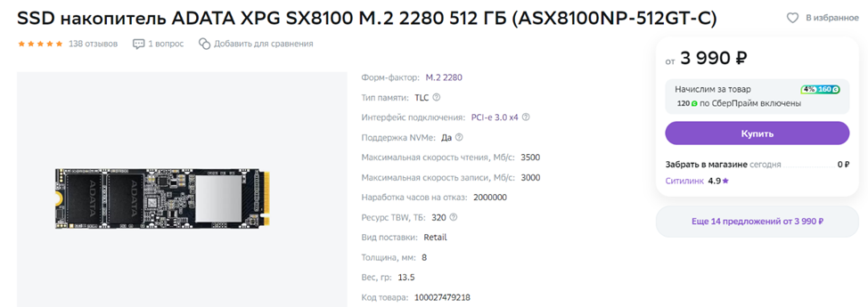 SSD ADATA XPG SX8100 M.2 2280 512 ГБ — вводите промокод fr3584i2731 и получайте скидку в 1000 рублей
