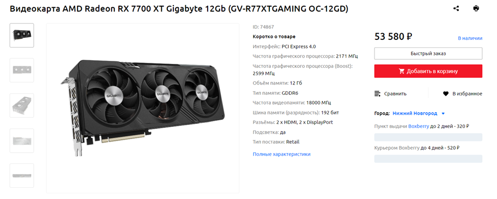 AMD Radeon RX 7700 XT – еще одна заслуживающая внимания «красная» игровая видеокарта. Если ваш бюджет на графический ускоритель – около 50 тысяч рублей, то «семь тысяч семисотая», вероятно, лучший вариант. В играх с трассировкой лучей она громит RTX 4060 Ti и лишь на 5-10% отстает от RTX 4070. Если же говорить о сценариях без рейтрейсинга, то новинка на 20-30% производительнее, чем RTX 4060 Ti, а еще обладает 12, а не 8 гигабайтами видеопамяти, при этом стоит она в российских магазинах не сильно дороже. Вообще, разница в рекомендованной стоимости между RX 7700 XT и RX 7800 XT составляет всего 50 долларов, и в подобных «идеальных условиях в вакууме» старшая модель смотрится явно привлекательнее. Но в отечественной рознице разрыв в цене намного больше, и RX 7700 XT – один из самых выгодных вариантов в своем ценовом сегменте.