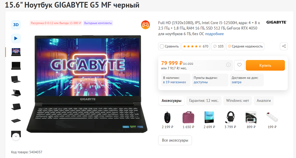 Рассмотрим еще один ноутбук от GIGABYTE — сейчас они обладают весьма привлекательным соотношением стоимости и характеристик. G5 MF – это лэптоп более «обычный», нежели предыдущий – с 15.6-дюймовым FullHD IPS экраном с частотой обновления 144 Гц. Процессор здесь установлен чуть послабее, Core i5-12500H, но это отнюдь не критично, особенно с учетом того, что G5 MF стоит на 5 тысяч дешевле, чем G6 MF. Видеокарта – та же самая, ноутбучная версия RTX 4050 (а десктопная пока и не вышла) с 6 гигабайтами видеопамяти. По оперативной памяти и SSD – все стандартно. Полагаю, на момент написания статьи это один из лучших игровых ноутбуков стоимостью до 80 тысяч рублей, а возможно, и лучший, если рассматривать только брендовые модели, предлагающиеся в крупных сетевых магазинах и не смотреть в сторону Noname-Китая и сомнительных предложений на маркетплейсах. Недостатки стандартные – не самая эффективная система охлаждения и сопутствующий перегрев.