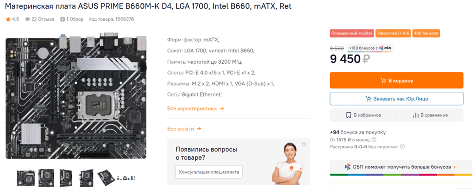 Материнскую плату стоит брать на чипсете B660 или B760 — они оптимальны по соотношению стоимости и характеристик для процессоров сокета LGA 1700, не поддерживающих ручной разгон посредством увеличения множителя. Выбирайте плату исходя из того, сколько каких разъемов вам требуется. Из достаточно доступных по цене вариантов могу посоветовать, например, ASUS PRIME B660M-K D4. У данной МП есть пара слотов M.2 PCI-Express для скоростных твердотельных накопителей, да и подсистема питания приличная. Есть даже небольшой радиатор, хотя с Core i5-12400F он не нужен. Но, как говорится, лишним не будет. Можно взять и другую плату от ASUS, MSI, GIGABYTE или ASRock. Продукции других производителей в большинстве случаев стоит избегать, особенно если речь идет о китайских Noname-брендах. Кстати, если хотите сэкономить, можно взять и плату на чипсете H610, например, MSI PRO H610M-B DDR4. Но тонкая настройка оперативной памяти будет недоступна. Она, впрочем, большинству пользователей и не нужна – достаточно XMP-профиля на 3200 МГц.