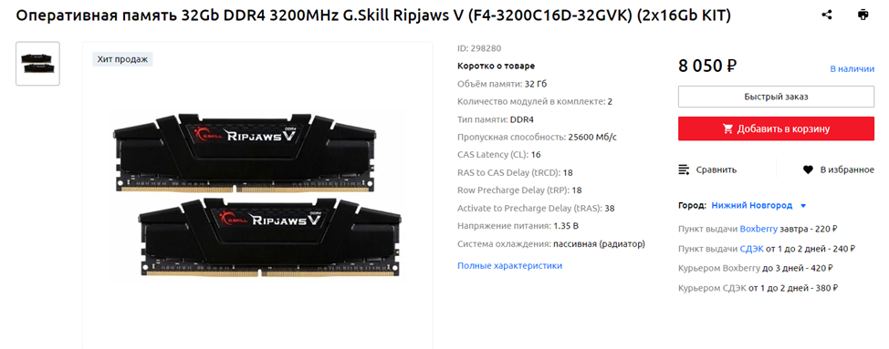 Оперативная память: 32Gb DDR4 3200MHz G.Skill Ripjaws V (F4-3200C16D-32GVK) (2x16Gb KIT)
