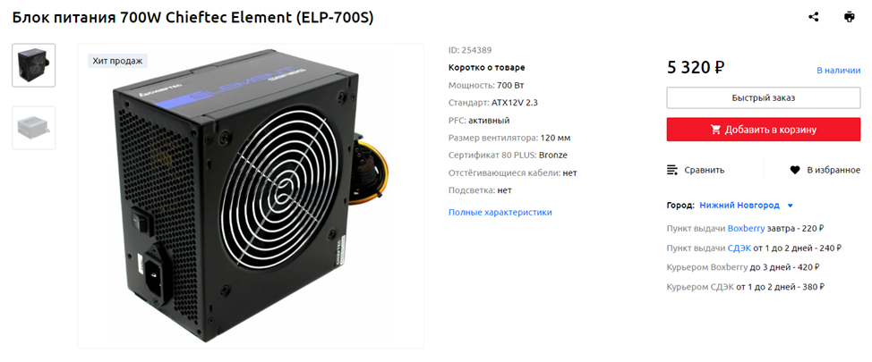 В бюджетном сегменте рынка блоков питания очень много решений низкого качества от сомнительных, а порой и от авторитетных производителей. Лучом света в этом темном царстве остается тайваньская компания Chieftec и еще несколько фирм, например, Deepcool и Zalman. Для сегодняшней сборки я предлагаю взять 700-ваттный блок питания – конечно, такая мощность в данном случае не нужна, даже с учетом солидного запаса сверху, но такой выбор позволит не менять БП при апгрейде ПК. Например, при установке более производительного и требовательного к питанию графического ускорителя одного из следующих поколений. Переплачивать за сертификаты 80 Plus, гарантирующие высокий КПД, за отстегивающиеся кабели и за подсветку я в данном случае считаю нерациональным. С базовыми функциями отлично справится и недорогой, но качественный БП уровня Chieftec Element ELP-700S, при этом он еще и достаточно тихий.