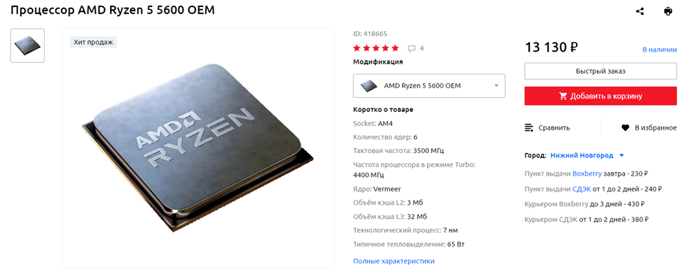 AMD Ryzen 5 5600 – это один из двух «народных шестиядерников», которые я часто рекомендую в рамках статей ежемесячной рубрики «Народный ПК». В отличие от Ryzen 5 5500, он поддерживает четвертую версию интерфейса PCI-Express. Что же касается игровой производительности — она мало отличается от Ryzen 5 5600X и Core i5-12400F. И, хотя последний все же смотрится несколько предпочтительнее, для «пять тысяч шестисотого» можно за меньшие деньги приобрести материнскую плату, да и сам CPU стоит дешевле конкурента. Также модель может похвастаться невысоким TDP, который, впрочем, ощутимо увеличивается в случае разгона. Оверклокинг позволяет достичь производительности 5600X, но тепловыделение при этом будет несколько больше, чем у «старшего брата». Напоследок стоит сказать, что важный плюс рассматриваемого процессора, как и в случае Ryzen 5 3600 – возможность будущего апгрейда с заменой его на CPU с 3D-кэшем, такой как Ryzen 7 5700X3D или Ryzen 7 5800X3D.