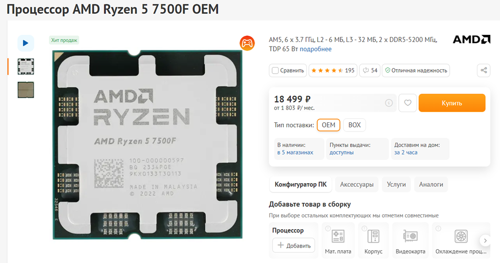 AMD Ryzen 5 7500F – это шестиядерный процессор, который хорош всем, кроме стоимости совместимых с ним материнских плат, а также модулей и комплектов оперативной памяти DDR5. Именно из-за дороговизны платформы его пока редко рекомендуют для игровых конфигураций. А ведь по игровой производительности он обгоняет и Core i5-12400F и Core i5-13400F. Впрочем, архитектура у них одна, так что это не слишком удивительно. Гораздо более примечательно, что 7500F способен посоперничать с Core i5-13400F и в производительности в многопоточных рабочих приложениях, хотя у него только 6 ядер против 6 P-ядер и 4 E-ядер у решения Intel. Если бы не цены на материнские платы и ОЗУ, это был бы, вероятно, лучший CPU в своей ценовой категории, сейчас же его стоит брать скорее с прицелом на будущее, под прогнозируемый апгрейд в рамках платформы AM5. От Ryzen 5 7600 он отличается немного пониженной частотой и отсутствием встроенного графического ядра.
