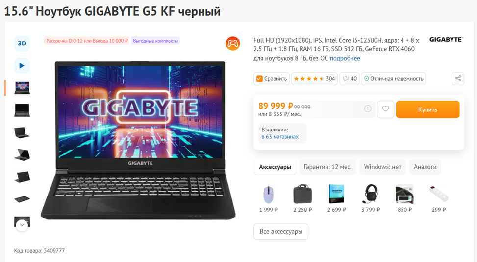 15.6" Ноутбук GIGABYTE G5 KF
