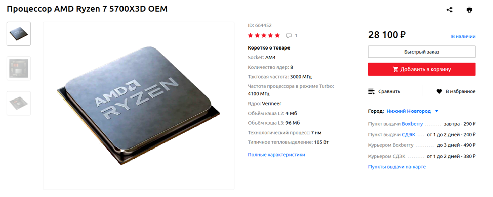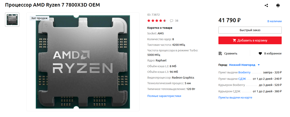 Поговорим про вершину развития сокета AM4 — AMD Ryzen 7 5800X3D, первый массовый процессор с дополнительным 3D-кэшем. С учетом того, что он вышел в 2022 году, его стоимость в российских магазинах выглядит несколько завышенной, но не стоит забывать, что, если вы являетесь обладателем сборки на AM4, более производительный CPU чем этот, в рамках платформы вы не купите. В целом, Ryzen 7 7700, Ryzen 7 5800X3D и Intel Core i5-13600K/KF выдают примерно одинаковый FPS в играх, и их стоимость, с учетом «обвязки», тоже различается не сильно. Да, «семь тысяч семисотый» стоит дешевле, зато переплатить придется за материнскую плату и за DDR5 ОЗУ. Есть ли смысл сейчас брать 5800X3D из магазина? Я не уверен, возможно, лучше поискать на вторичке. Все-таки люди постепенно переходят с сокета AM4 на AM5 и интеловский LGA 1700, и с выходом новых поколений CPU все больше 5800X3D можно будет найти на сайтах объявлений.