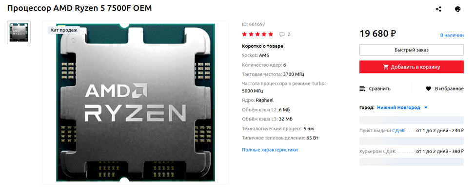 Рассматривать шестиядерный процессор AMD Ryzen 5 7600X я не вижу особого смысла – в российских магазинах он стоит на несколько тысяч рублей дороже, чем 7600, при этом разница в производительности при разблокированном лимите TDP между ними минимальная. Гораздо более интересно смотрятся Ryzen 5 7600 и Ryzen 5 7500F. Отличаются они сотней мегагерц тактовой частоты и наличием у «семь тысяч шестисотого» встроенного графического ядра.