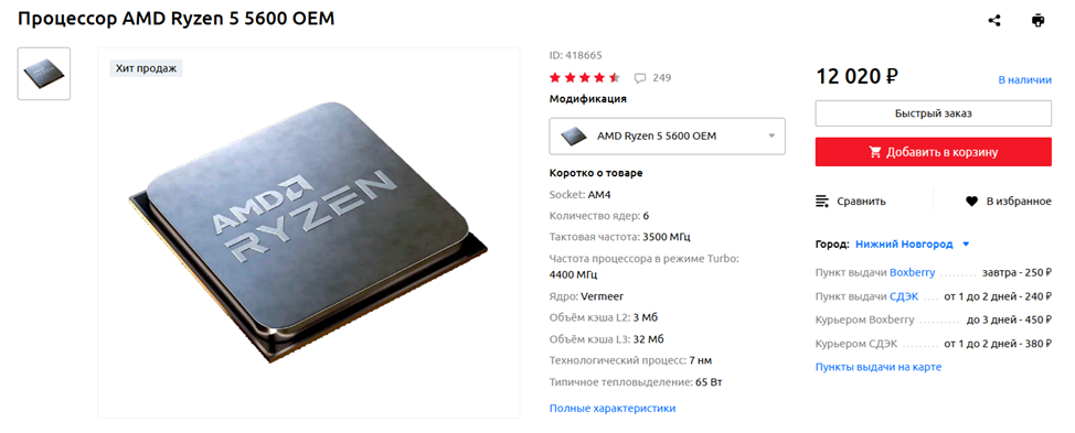 Переходим к народным, бюджетным вариантам стоимостью менее 15 тысяч рублей. Первый из них – шестиядерный процессор сокета AM4 под названием Ryzen 5 5600. Я часто рекомендую его для недорогих игровых конфигураций, и его есть за что рекомендовать. Сочетание доступной цены и более, чем достойной, с учетом этой самой цены, производительности в любых сценариях использования и делает этот процессор таким популярным – в особенности в России и в других странах, где зарплаты редко исчисляются тысячами долларов. А еще он нетребователен к материнской плате и охлаждению, хотя если в будущем вы хотите его заменить, например, на Ryzen 7 5700X3D, материнскую плату стоит брать с приличной подсистемой питания, защищенной от перегрева радиатором. В целом же, на мой взгляд, AMD Ryzen 5 5600 и Intel Core i5-12400F – лучшие процессоры стоимостью до 15 тысяч рублей из тех, что можно приобрести в РФ в официальных магазинах. Ждем, пока выйдут Ryzen 9000, возможно, тогда 7500F подешевеет.
