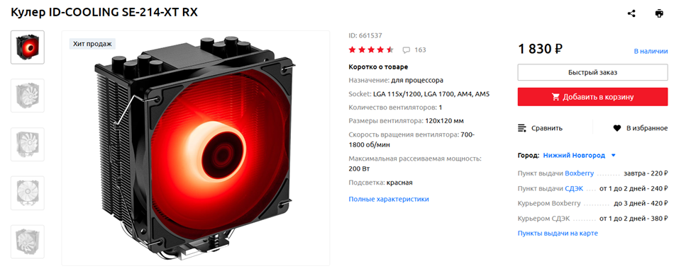 AMD Ryzen 5 5600 по современным меркам и близко не является горячим процессором – для его охлаждения хватит и боксового кулера. Но, как я не устаю повторять, боксовые кулеры как Intel, так и AMD шумные и неэффективные, а переплата за них и за дополнительные пару лет гарантии в случае приобретений BOX-версий процессоров вряд ли оправдывает себя. На мой взгляд, оптимальнее покупать CPU в OEM-исполнении и систему охлаждения от стороннего производителя. Так, в ассортименте китайской компании ID-Cooling есть множество бюджетных кулеров стоимостью до 2 тысяч рублей, рассчитанных, если верить заявлениям производителя, на TDP до 180-200 Вт. И даже если это некоторое преувеличение, уж для «пять тысяч шестисотого» возможностей такого кулера, как SE-214-XT RX хватит вне всяких сомнений. Главное – внимательно читайте инструкцию по установке, и, при необходимости, посмотрите видео. Ну или поручите сборку компьютера профессионалам.