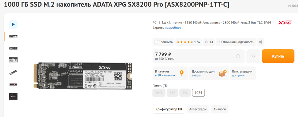Если проблем с бюджетом не наблюдается, для игровой конфигурации в 2024 году лучше выбирать твердотельный накопитель на 2 терабайта, причем желательно с DRAM-буфером. В рамках данной статьи нас ограничивает лимит в 80 тысяч рублей, поэтому для начала придется обойтись терабайтным SSD – в будущем вы сможете добавить к нему еще один. Хоть на 2, хоть на 4 терабайта – свободный разъем имеется. Как обычно, бюджетные китайские накопители сомнительного качества и неизвестно на каких чипах я вам рекомендовать не стану. Да и зачем? На рынке есть недорогие, но достаточно качественные и надежные модели ADATA, такие, как Legend 960 (PCI-E 4.0) и XPG SX8200 Pro (PCI-E 3.0). Возможностей последнего, кстати, будет вполне достаточно для геймерского ПК бюджетного, среднего или даже субфлагманского уровня.