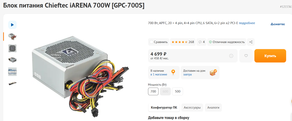 Я часто рекомендую в своих статьях блоки питания компании Chieftec – впервые я познакомился с продукцией бренда в 2010 или 2011 году и с тех пор в ней не разочаровался. На рынке БП мало фирм, предлагающих в бюджетном ценовом сегменте качественные решения — кроме, собственно, Chieftec, я сходу назову разве что Zalman, Deepcool, Cooler Master и Thermaltake. Так вот — для нашей сборки с солидным запасом хватит и 500-ваттного БП, но с учетом будущей замены процессора и видеокарты на более требовательные стоит рассмотреть вариант с приобретением 700-ваттного. Благо, блоки питания на 500 Вт и 700 Вт стоят почти одинаково, разница составляет около тысячи рублей. Хорошо подойдет, например, Chieftec iARENA GPC-700S – модель отличается высокой надежностью, хорошими для бюджетного БП электрическими характеристиками и тихой работой.