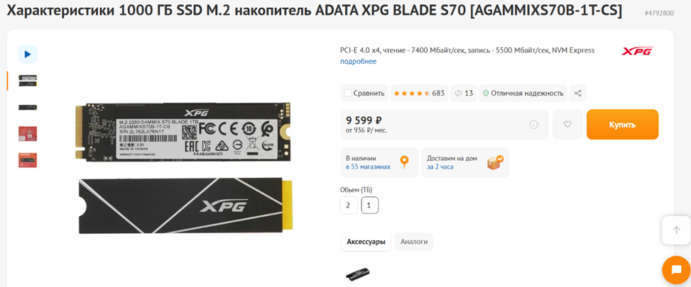 Я предложил бы сразу установить в сборку твердотельный накопитель емкостью 2 терабайта, но тогда придется экономить на видеокарте, а это недопустимо. Поэтому изначально придется обойтись терабайтником, но во второй слот в будущем советую докупить как минимум двухтерабайтник. Среди недорогих SSD могу порекомендовать ADATA XPG BLADE S70 – это быстрый и надежный накопитель с DRAM-буфером, основанный на контроллере Innogrit IG5236 и 176-слойной 3D TLC памяти Micron. До уровня Samsung 980 Pro, или, тем более, Samsung 990 Pro, модель, конечно, не дотягивает, но разницы в повседневном использовании вы не заметите – только в специализированных тестах. А ещё накопители южнокорейской корпорации стоят примерно в полтора раза дороже. Лучше вложить побольше средств в графический ускоритель.