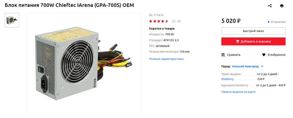 Блок питания традиционно предложу взять с запасом по мощности – на 700 Вт. Например, Chieftec IArena GPA-700S. Да, по линии 12В у него только 648, а не 700 Вт, но это хороший результат для недорогой модели, особенно с учетом, что БП в целом отличается достойными электрическими показателями и высокой надежностью. В бюджетном ценовом сегменте Chieftec предлагает, пожалуй, одни из лучших блоков питания с точки зрения соотношения стоимости и характеристик – поспорить с компанией могут разве что Zalman, Deepcool и еще пара брендов. Да, за 4-6 тысяч рублей вы не получите запредельного КПД или модульной системы подключения кабелей. Зато получите стабильное питание, тишину и надежность. А этого за такие деньги вполне достаточно. Сам я сталкивался с блоками питания Chieftec не раз, и у меня осталось о них исключительно хорошее впечатление, в отличие, например, от сверхбюджетных ExeGate, которые ставят в сборки некоторые горе-мастера.