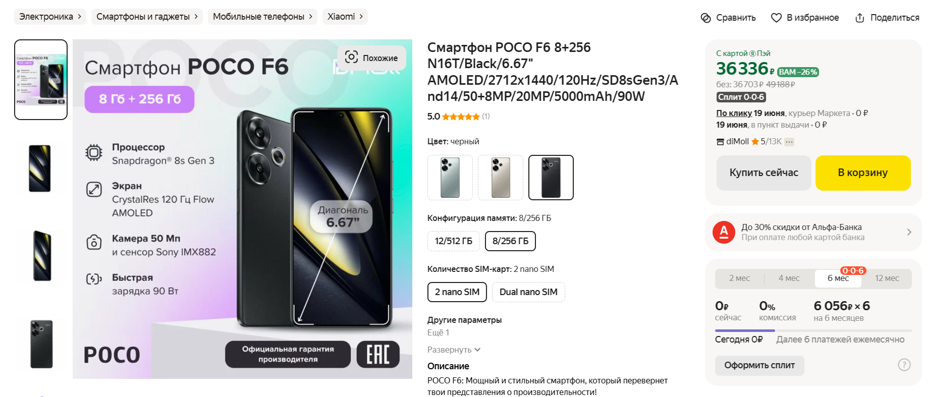 Смартфоны Poco с выхода самого первого устройства линейки могут похвастаться выгодным соотношением стоимости и характеристик – это своеобразная «фишка» бренда. И если, например, модели OnePlus из «убийц флагманов» превратились в типичные флагманы с соответствующей ценой, то решения Poco F-серии – это по-прежнему субфлагманские смартфоны, способные по многим параметрам потягаться с флагманскими. Впрочем, некоторых черт флагманов у них все-таки нет – например, полной защиты от пыли и влаги в соответствии со стандартом IP68 и крутых камер. Но об этом позже, а сейчас – о цене. Приобрести Poco F6 на старте продаж с учетом акций и скидок в России можно от 36 тысяч рублей. На AliExpress — чуть дешевле, но это долгое ожидание и оплата пошлины, поскольку беспошлинный порог снова снизили с 1000 до 200 евро.
