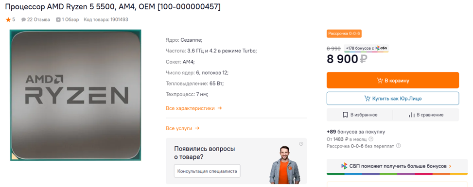 К дополнительным преимуществам «пять тысяч пятисотого» и «три тысячи шестисотого» можно отнести невысокое энергопотребление и тепловыделение – рассматриваемым процессорам не требуется материнская плата с мощной подсистемой питания. Не нужен и продвинутый кулер – достаточно будет недорогого башенного охладителя с заявленным TDP 150-180 Вт. Что касается будущего апгрейда — сборка не предусматривает замену процессора на восьмиядерник с 3D-кэшем, поскольку для этого нужны более дорогие материнская плата и система охлаждения.