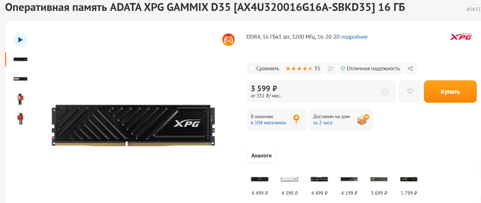 Оперативная память: ADATA XPG GAMMIX D35 AX4U320016G16A-SBKD35 16 ГБ